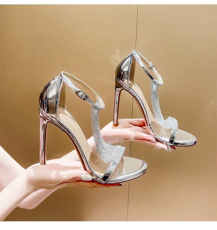 淘宝2023年新款一字带凉鞋女小众气质名媛银色性感水钻细跟高跟鞋女鞋