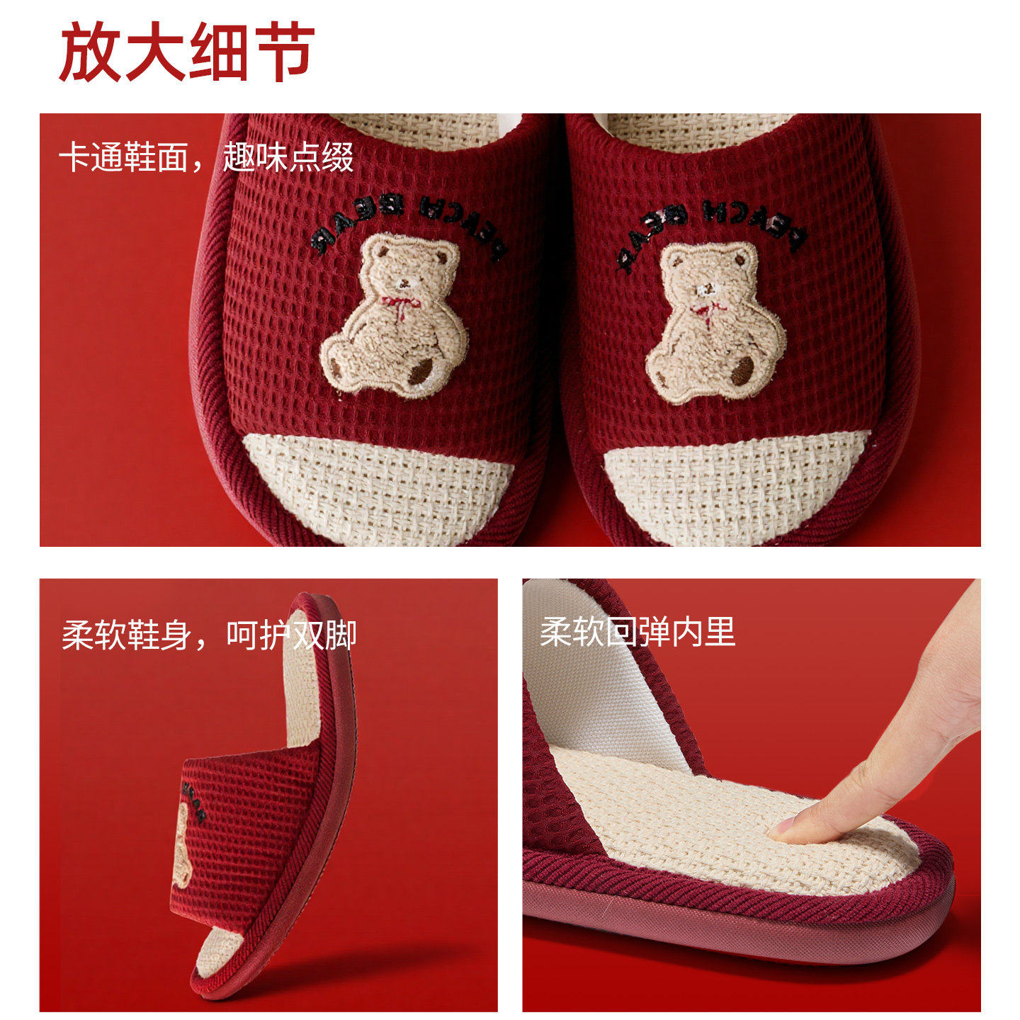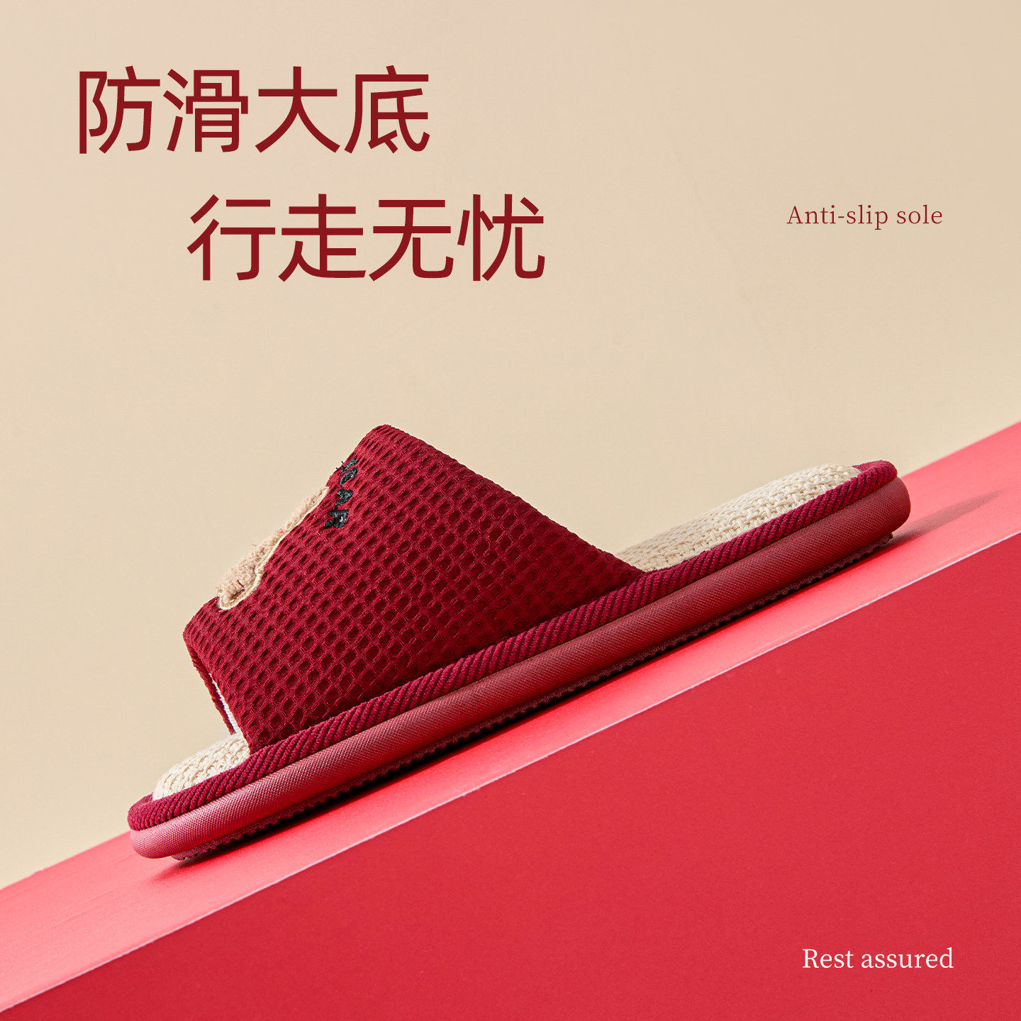 天猫本命年红色亚麻拖鞋女四季室内家居防滑防臭布艺情侣棉麻拖鞋春秋