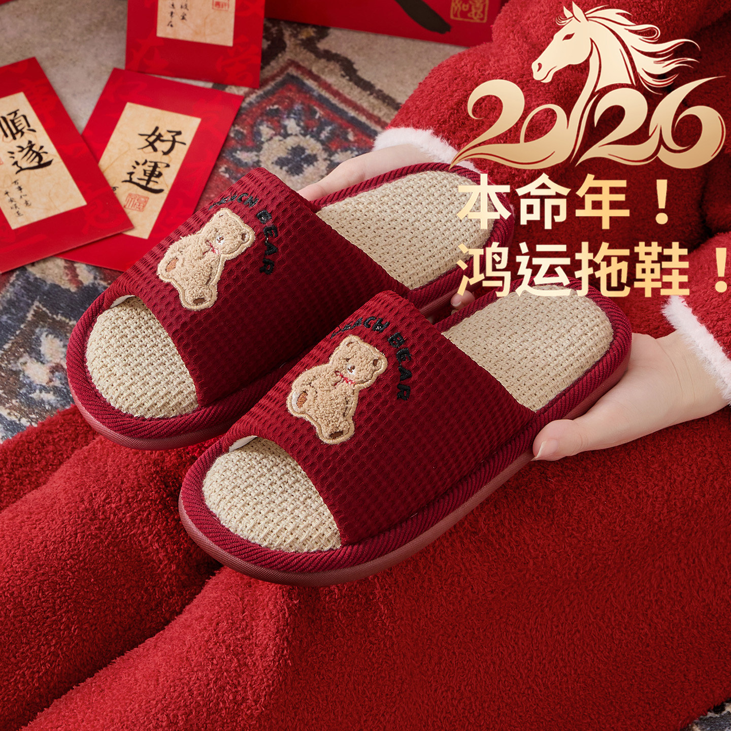 这款本命年红色亚麻拖鞋,专为女性设计,采用天然亚麻与棉麻混纺面料,透气亲肤,四季皆宜。经典中国红寓意吉祥喜庆,特别适合本命年穿着,增添好运氛围。鞋面布艺工艺精致,内里柔软舒适,春秋单穿、冬季搭配袜子皆适宜。防滑耐磨橡胶大底,室内行走安全稳当,有效防臭抑菌,保持双脚干爽。简约情侣款设计,男女可配,居家温馨又时尚。无论是自用还是送礼,都是贴心实用的家居好物,兼顾美观与功能性,让每一天都从脚下开始温暖舒适。