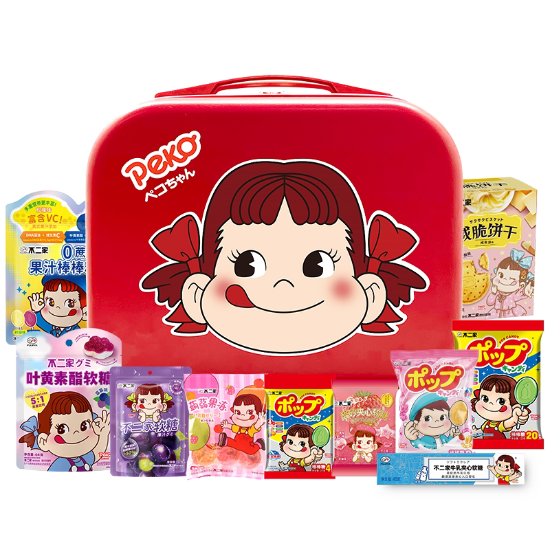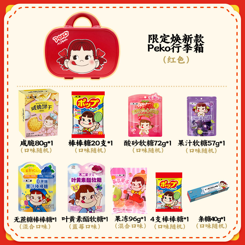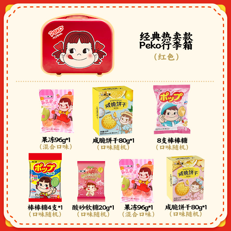 不二家定制PEKO行李箱化妆箱糖果零食伴手礼网红礼盒,是专为时尚女性打造的精致礼物。以经典卡通形象“牛奶妹PEKO”为主题,融合萌趣设计与实用功能,内含精美化妆镜、收纳隔层及多款不二家经典糖果零食,既是便携化妆箱,也是甜蜜零食盒。礼盒包装清新可爱,附赠手提行李箱造型外盒,颜值与仪式感满分,适合生日、节日或纪念日送给女友、闺蜜。作为网红爆款伴手礼,它不仅传递满满心意,更彰显独特品味,让收礼者在打开瞬间收获惊喜与幸福感,是表达爱意与关怀的绝佳选择。