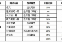 英语四级的题型包括听力、阅读理解、翻译和作文4个部分。写作部分测试学生用英语进行书面表达的能力,要求考生根据所提供的信息及提示写出一篇短文。听力部分包括短篇新闻3段,听力篇章3篇,测试题型都为单选。阅读理解部分包括1篇长篇阅读和3篇仔细阅读,测试学生在不同层面上的阅读理解能力,包括理解篇章或段落的主旨大意和重要细节、综合分析、推测判断以及根据上下文推测词义等能力。