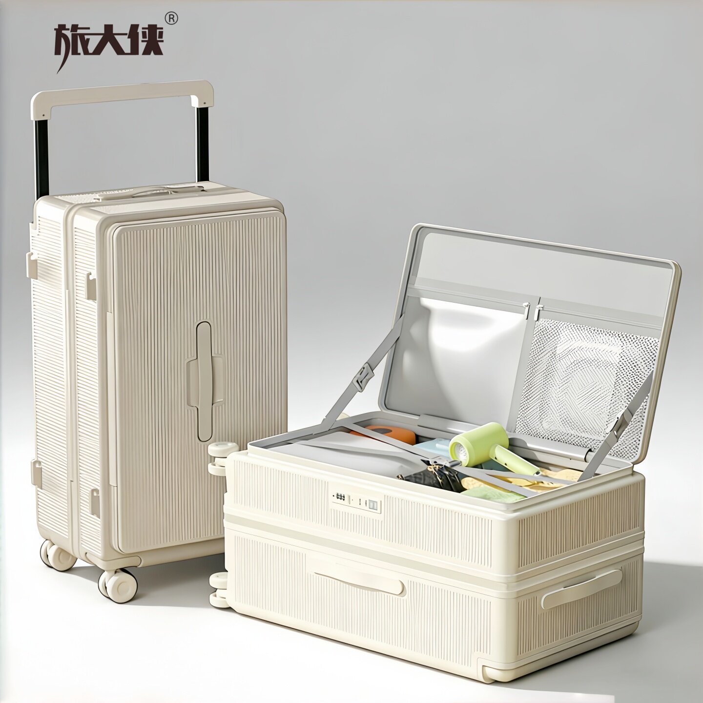 旅大侠2026新款侧开盖大容量宽拉杆行李箱,专为现代旅行者设计,兼顾实用与时尚。采用高强度PC+ABS材质,轻盈抗摔,经久耐用。创新侧开盖设计,取物更便捷,告别翻箱倒柜。加宽拉杆系统,推拉顺滑省力,适应不同身高需求。360°静音万向轮,灵活转向,静音顺滑,轻松应对各种路况。内部大容量分区收纳,衣物整齐有序。男女通用设计,简约大气,适合商务出行或长途旅行。20寸登机箱规格,轻松登机,是旅途中的理想伴侣。