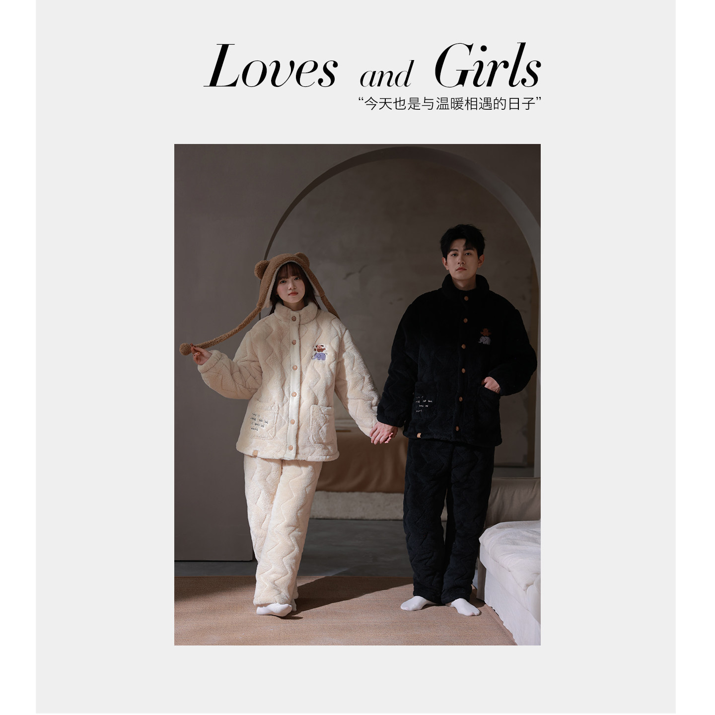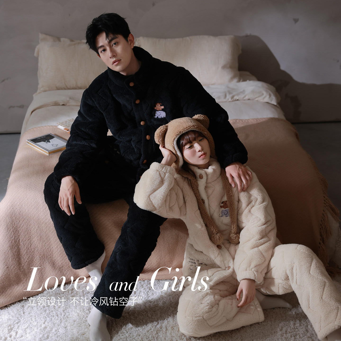 天安之伴情侣睡衣冬季加厚三层夹棉女保暖珊瑚绒休闲男士家居服加绒