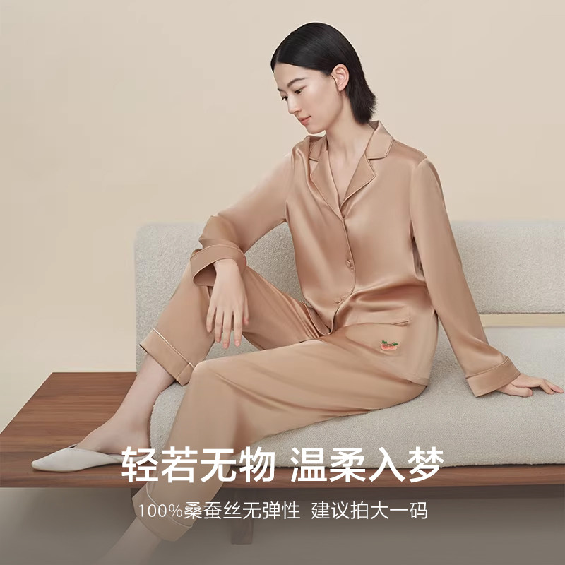 天猫万事利春夏新款100%桑蚕丝真丝睡衣女款情侣可外穿家居服套装好柿
