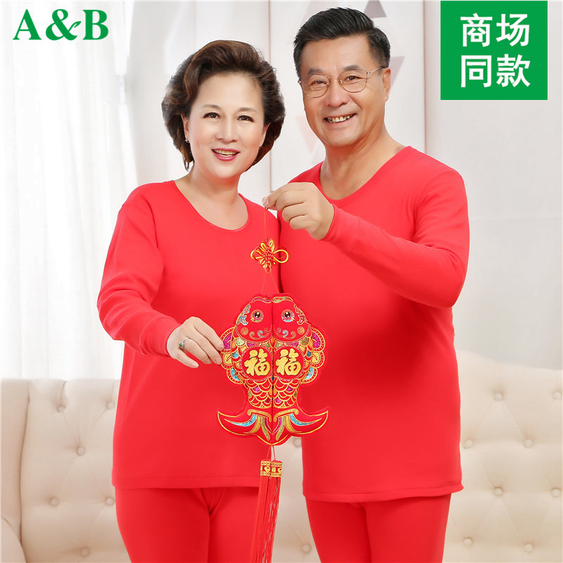 天猫AB内衣100%纯棉保暖内衣女士薄款秋衣秋裤男士全棉毛衫红色套装男
