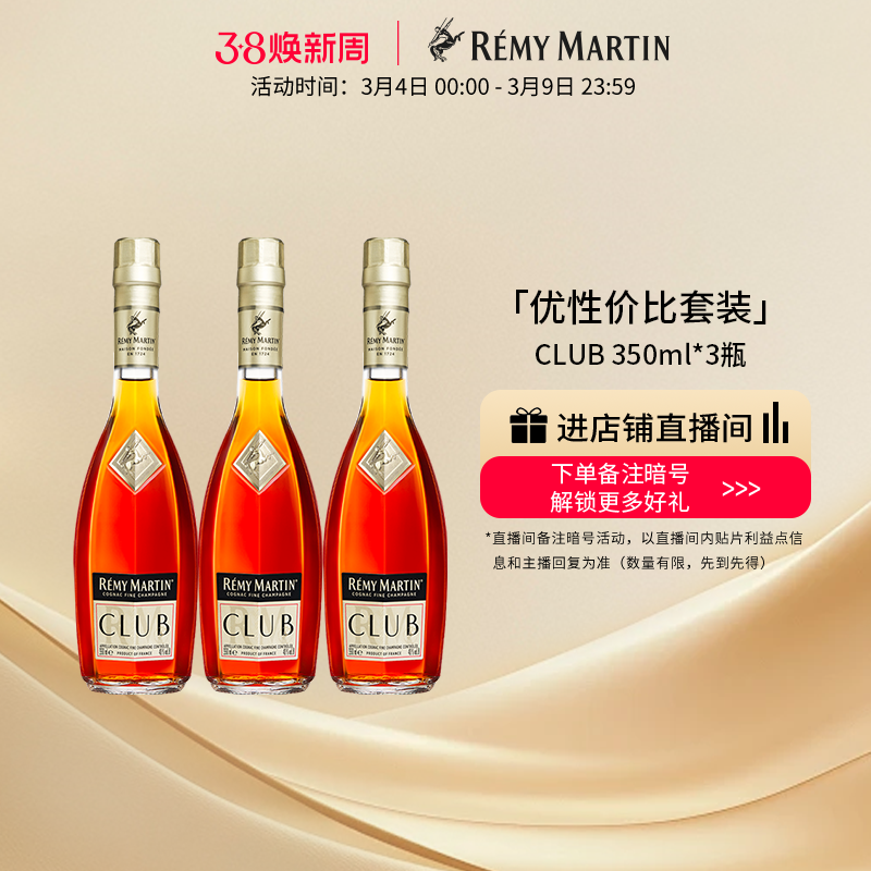 天猫【品牌旗舰】法国人头马CLUB优质香槟区干邑白兰地350ml*3瓶洋酒