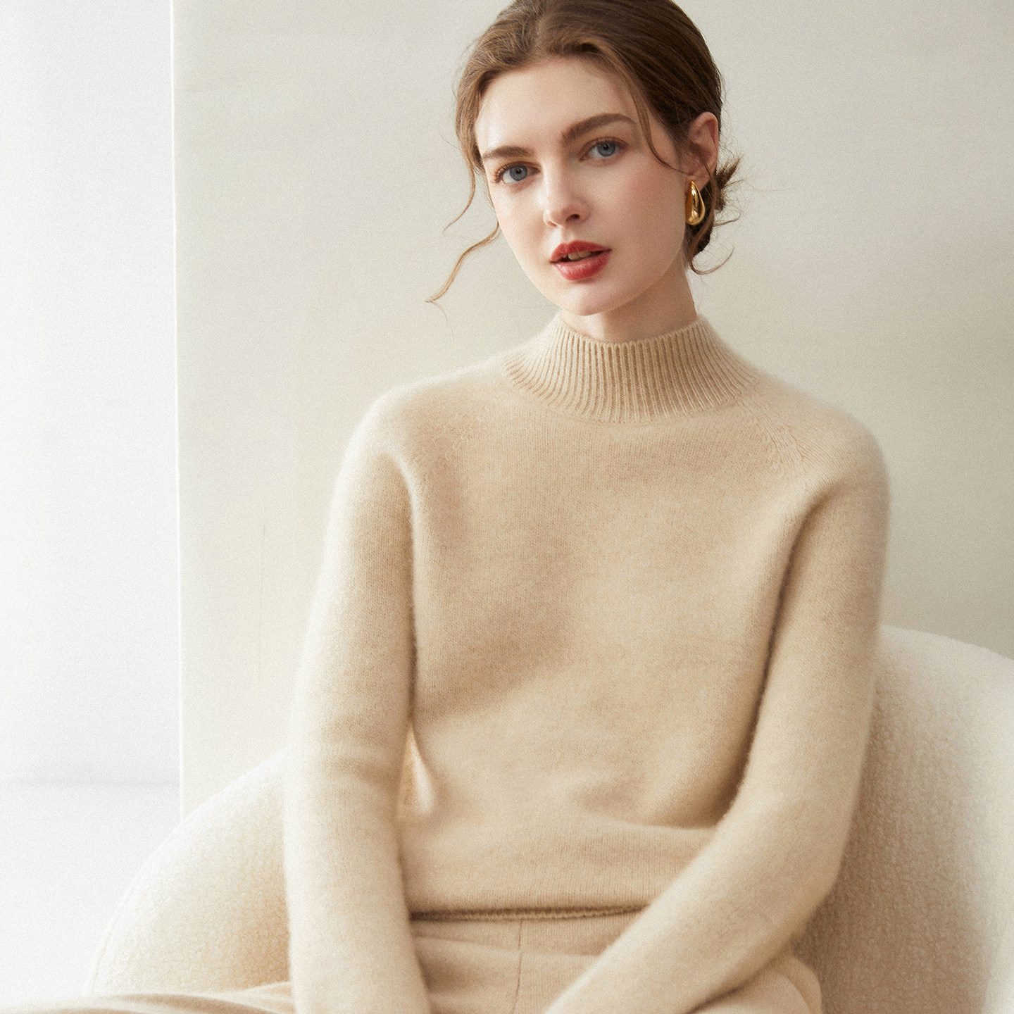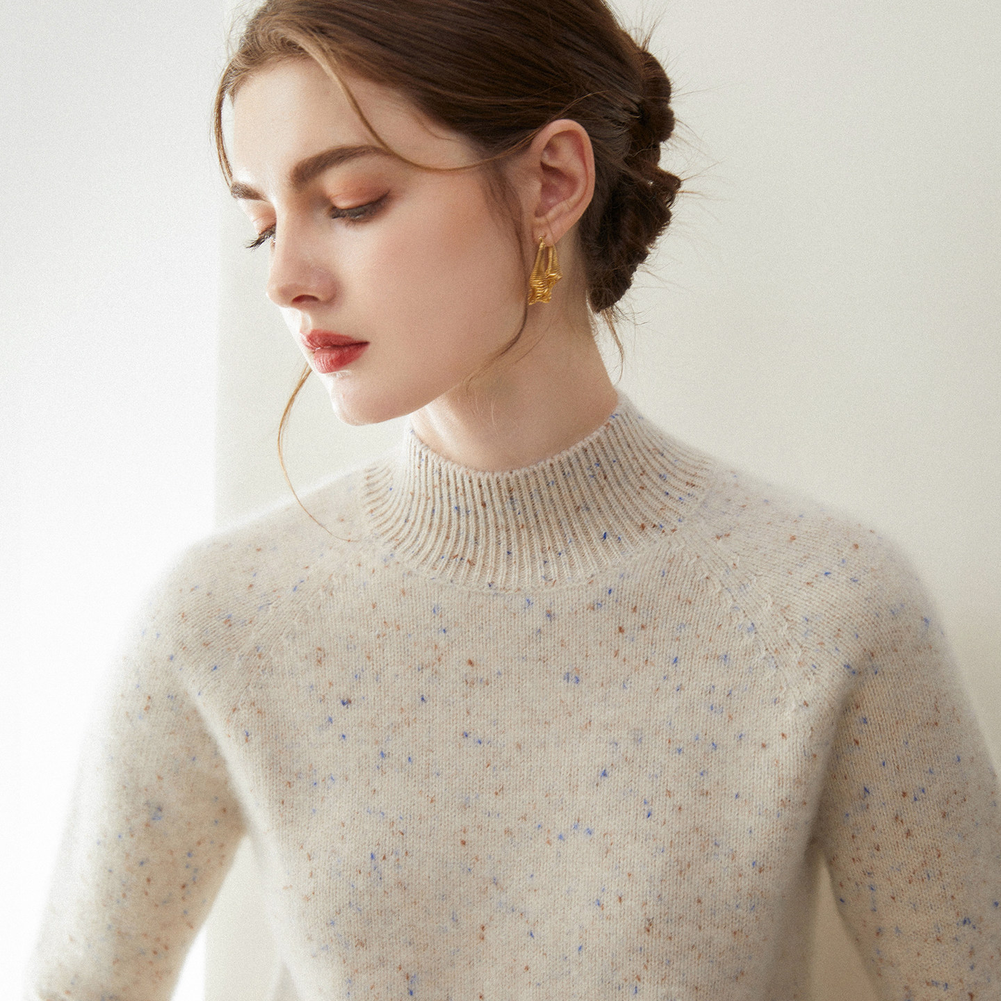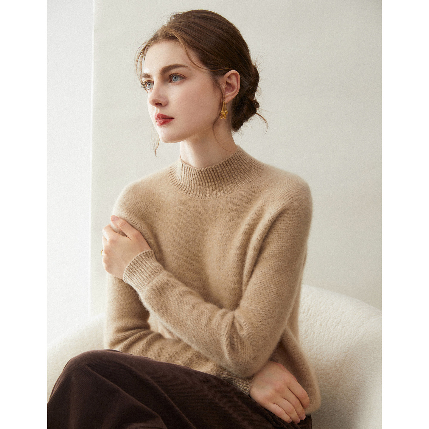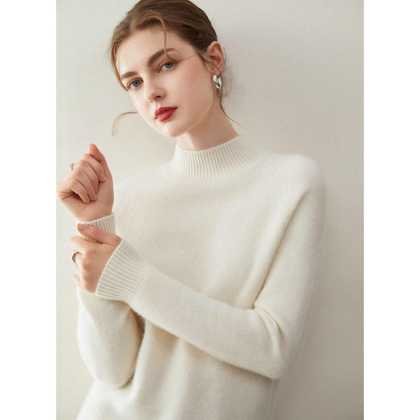 淘康家线~新款纯山羊绒衫女卷边半高领纯色宽松针织打底衫毛衣内搭