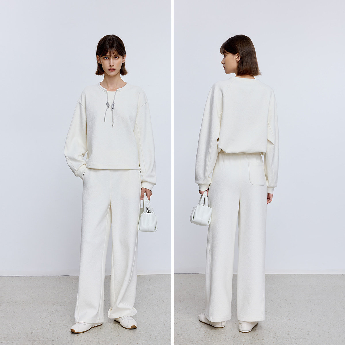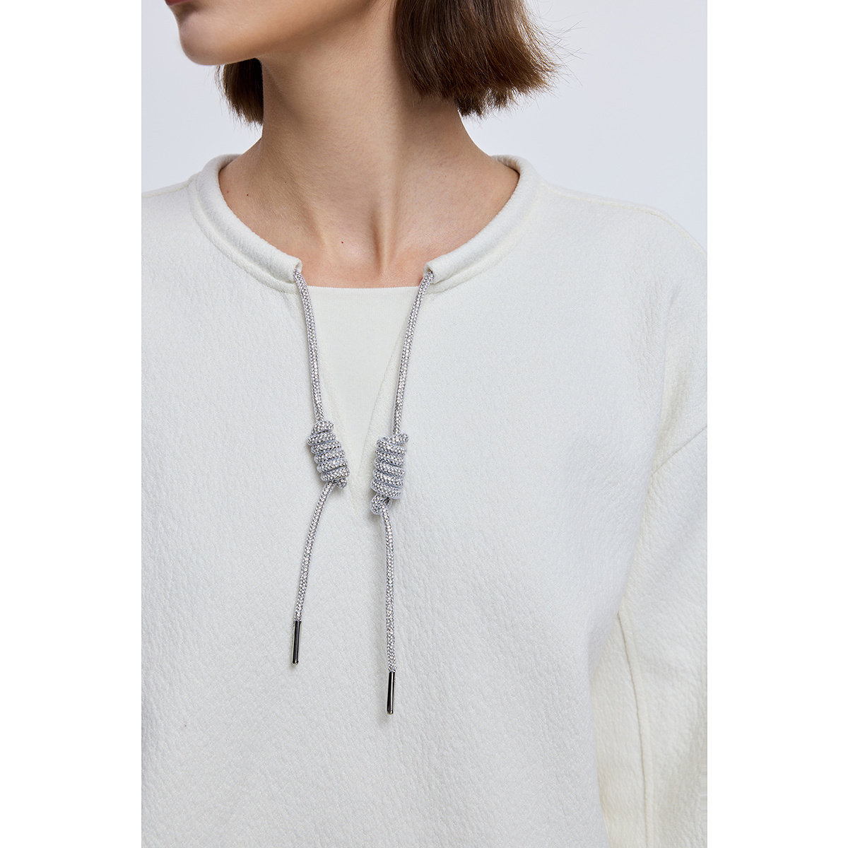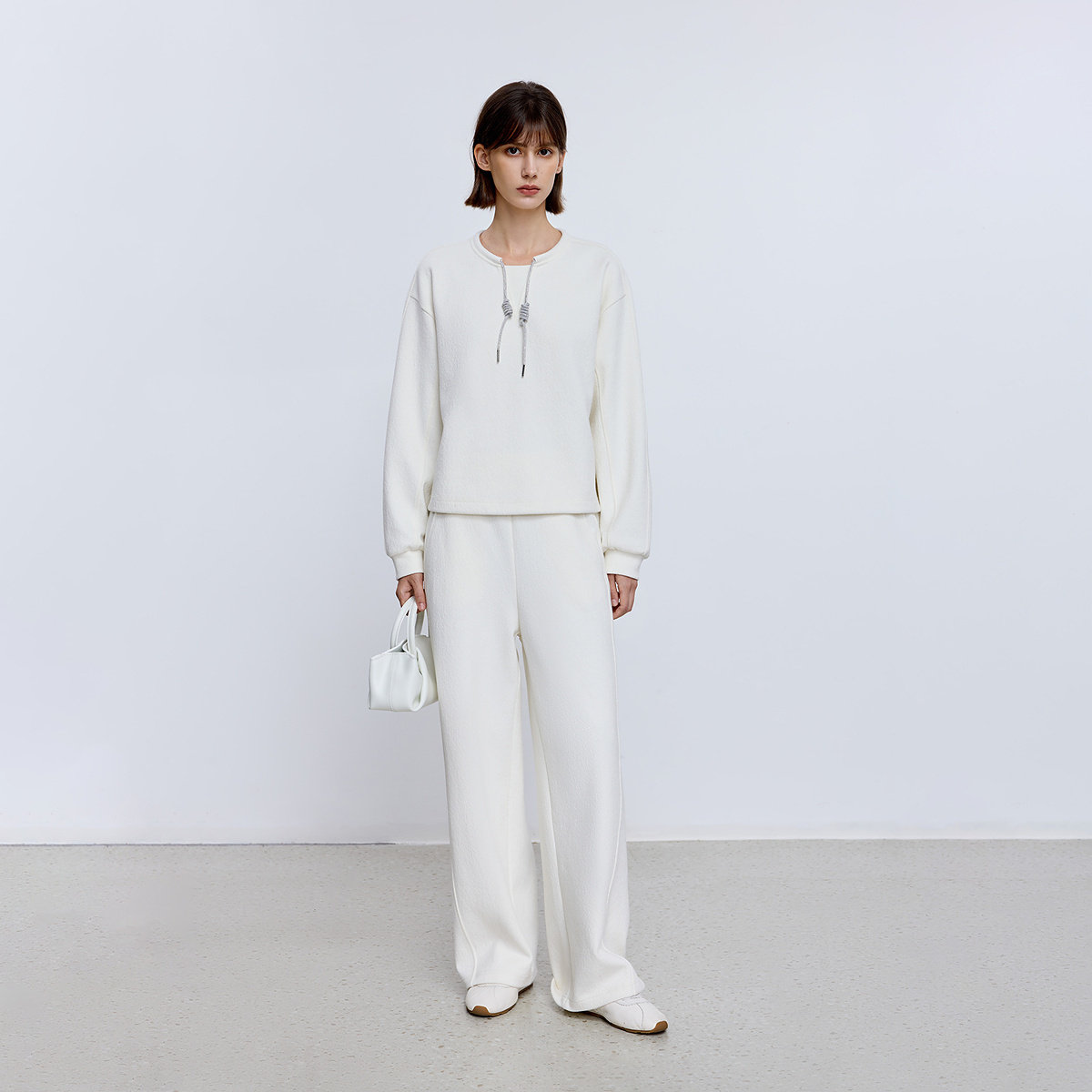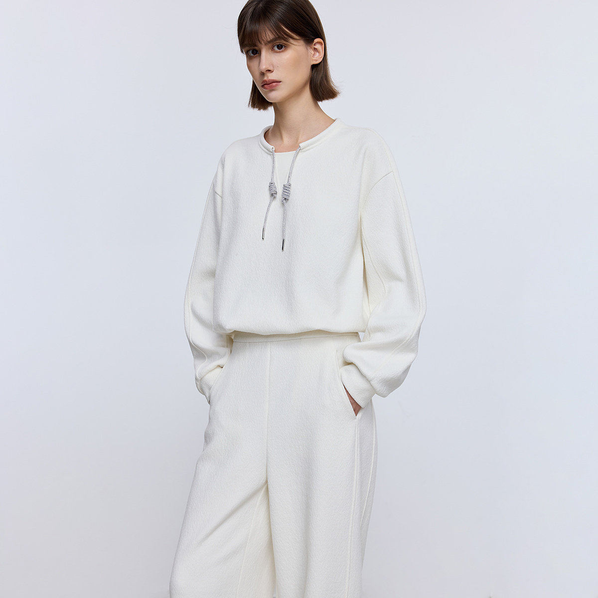 天猫LILY2025冬新款女装极简风宽松休闲通勤白色系带圆领套头卫衣短款