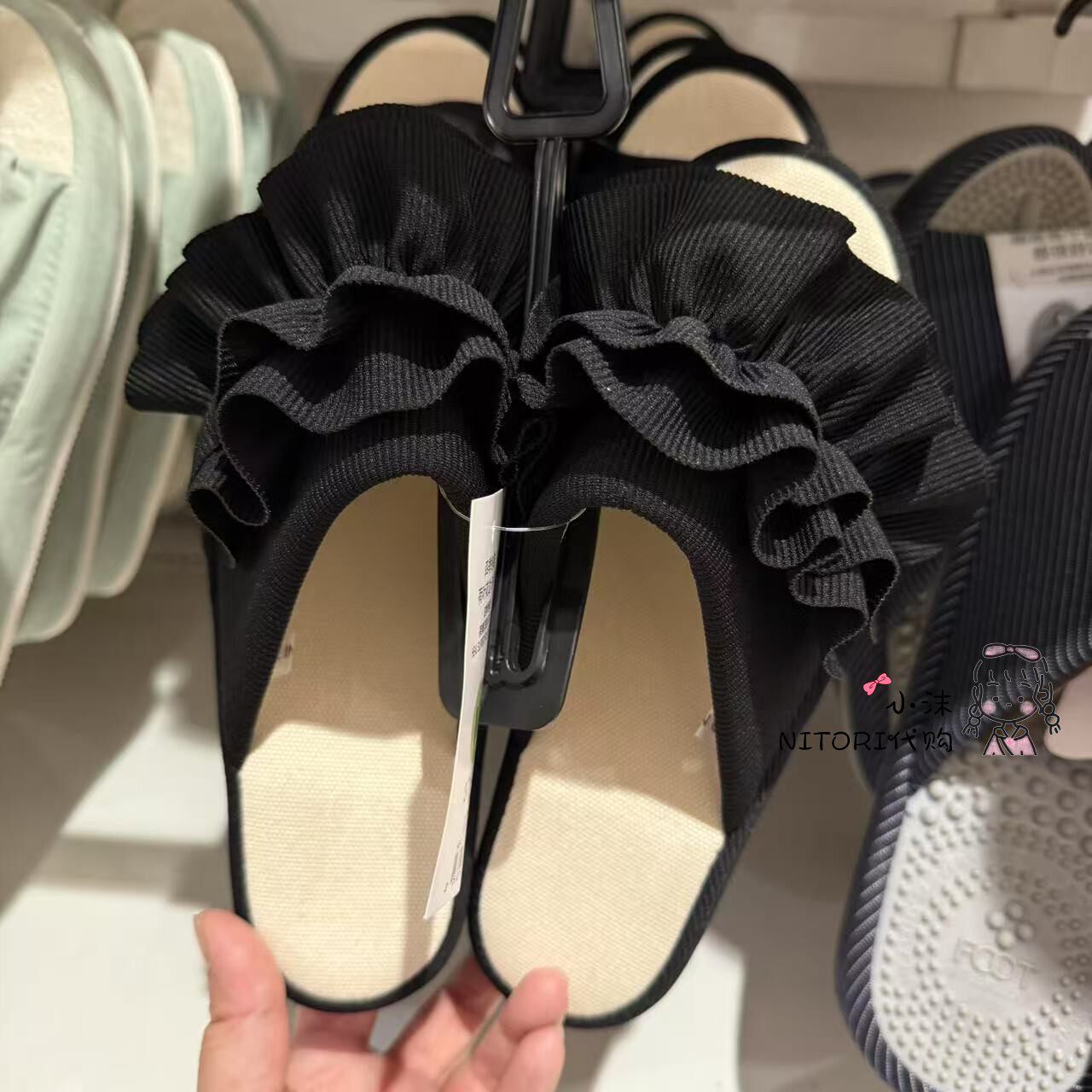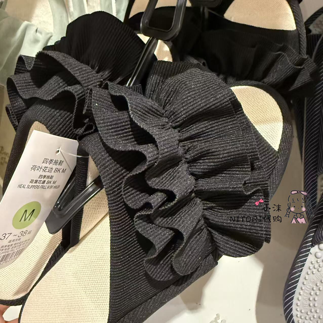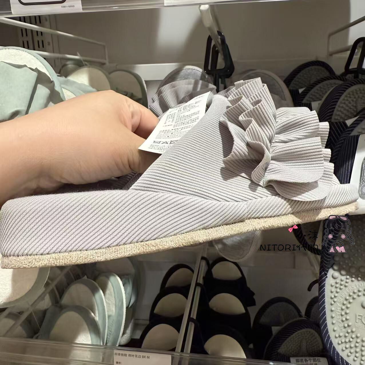淘宝NITORI宜得利 四季拖鞋荷叶花边灰色黑色地板拖鞋 女士露趾居家鞋