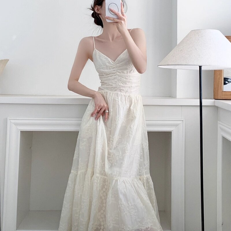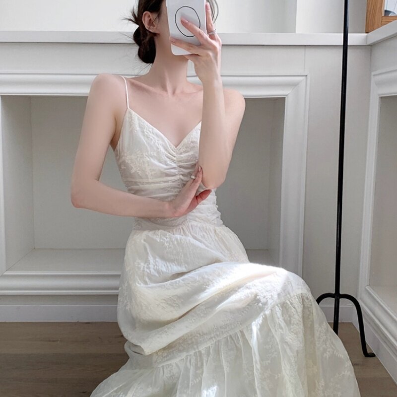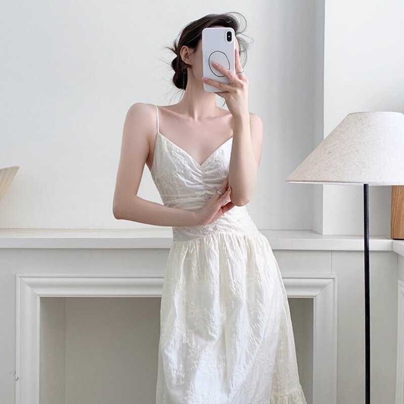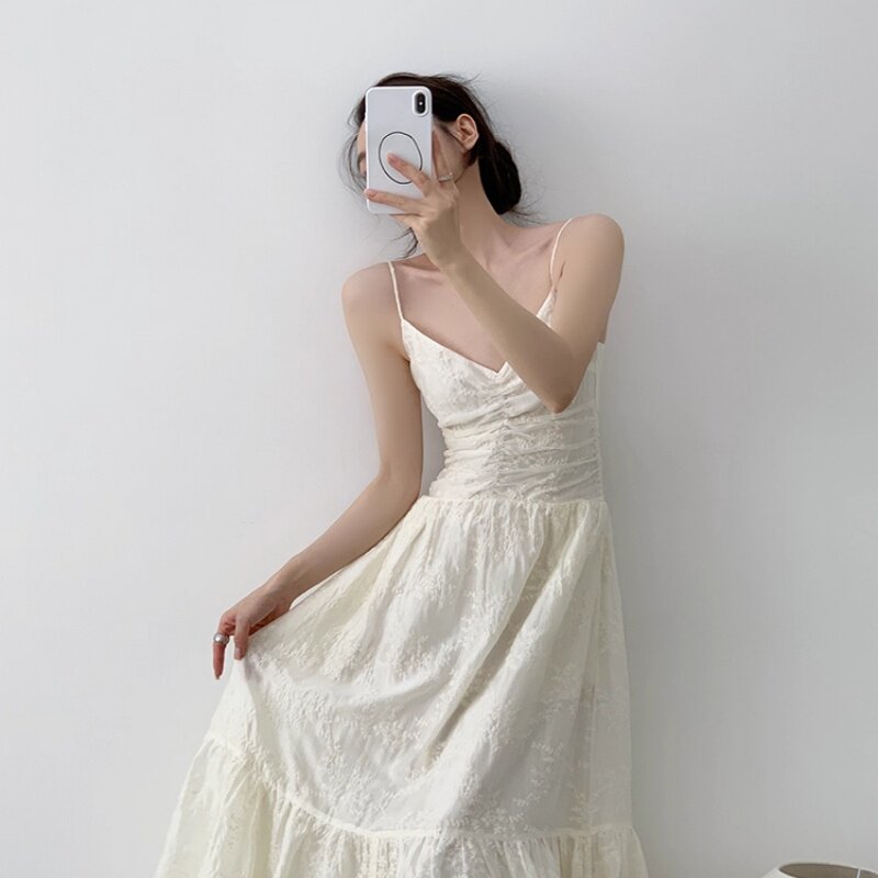 淘宝茶歇法式方领吊带连衣裙女夏季新款收腰小白裙气质显瘦小个子长裙