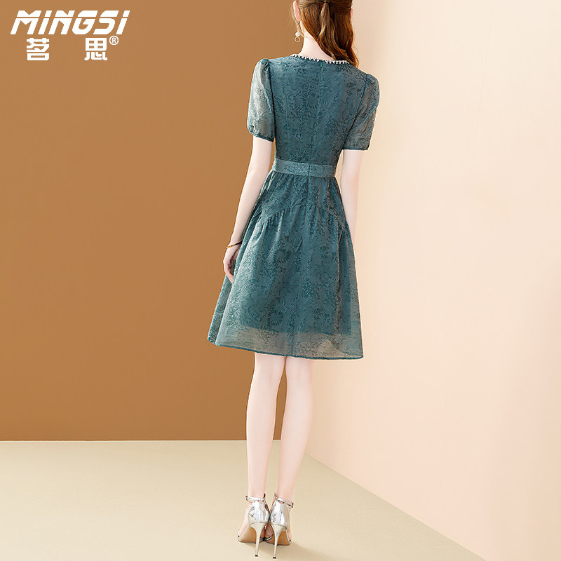 天紫涵木耳边花朵刺绣绿色连衣裙女士夏季新款法式浪漫设计感a字裙