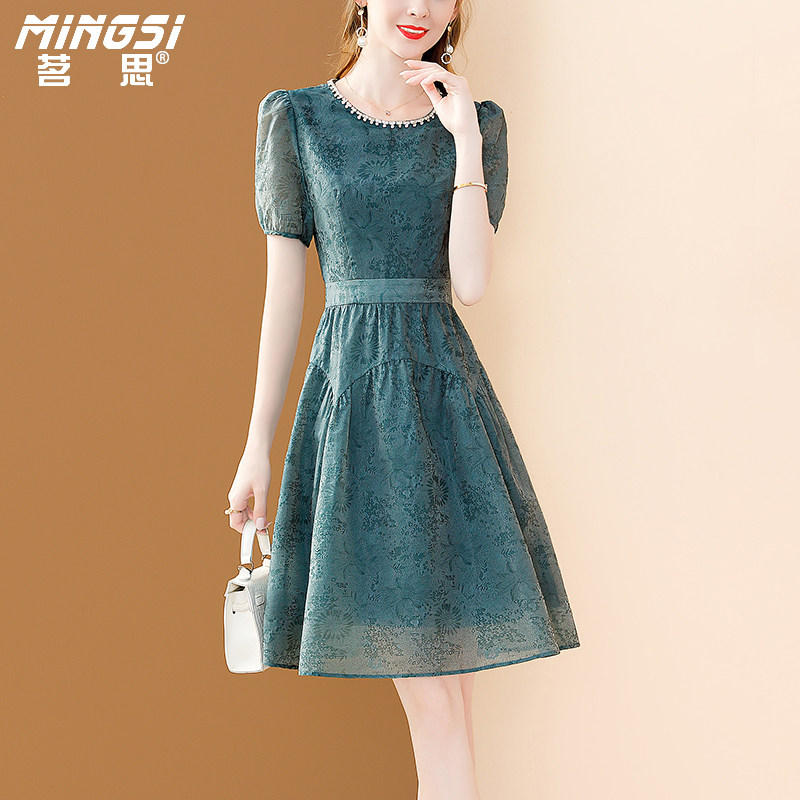 紫涵木耳边花朵刺绣绿色连衣裙女士夏季新款法式浪漫设计感a字裙