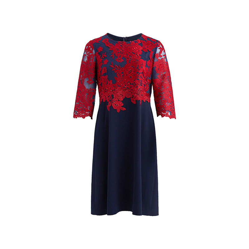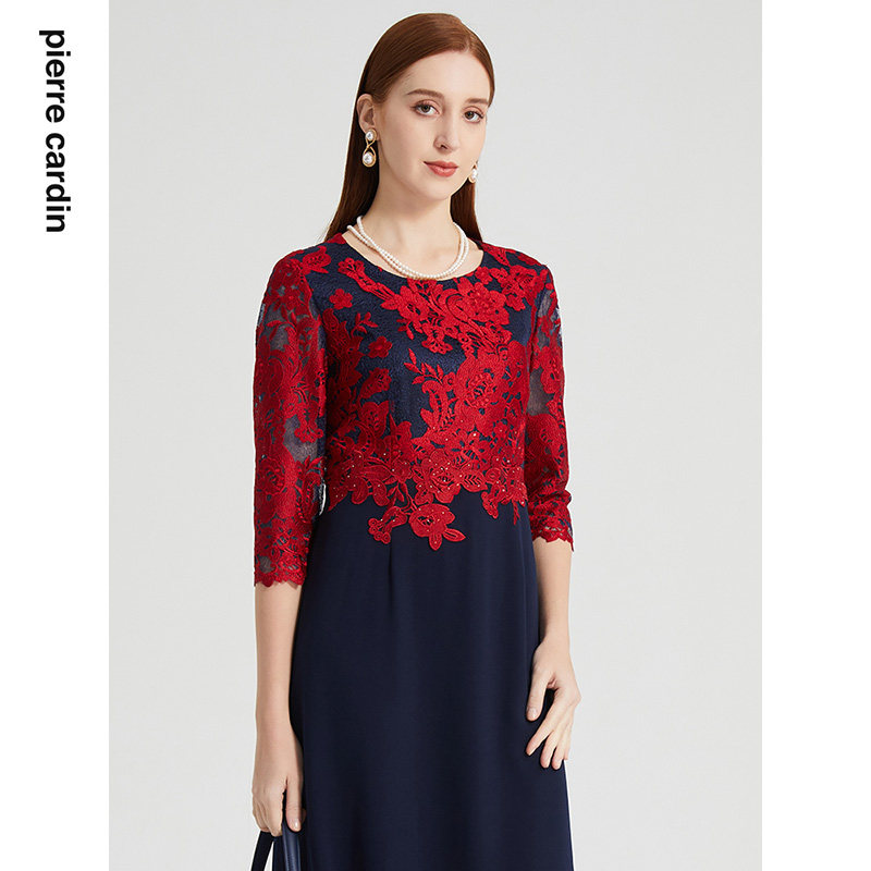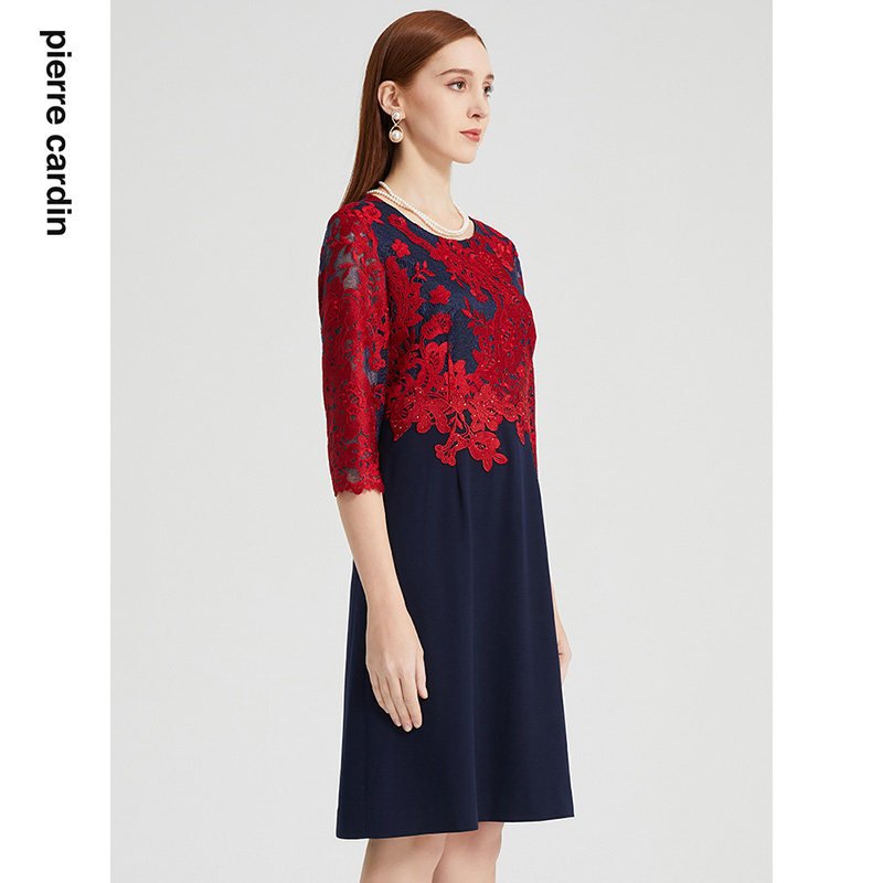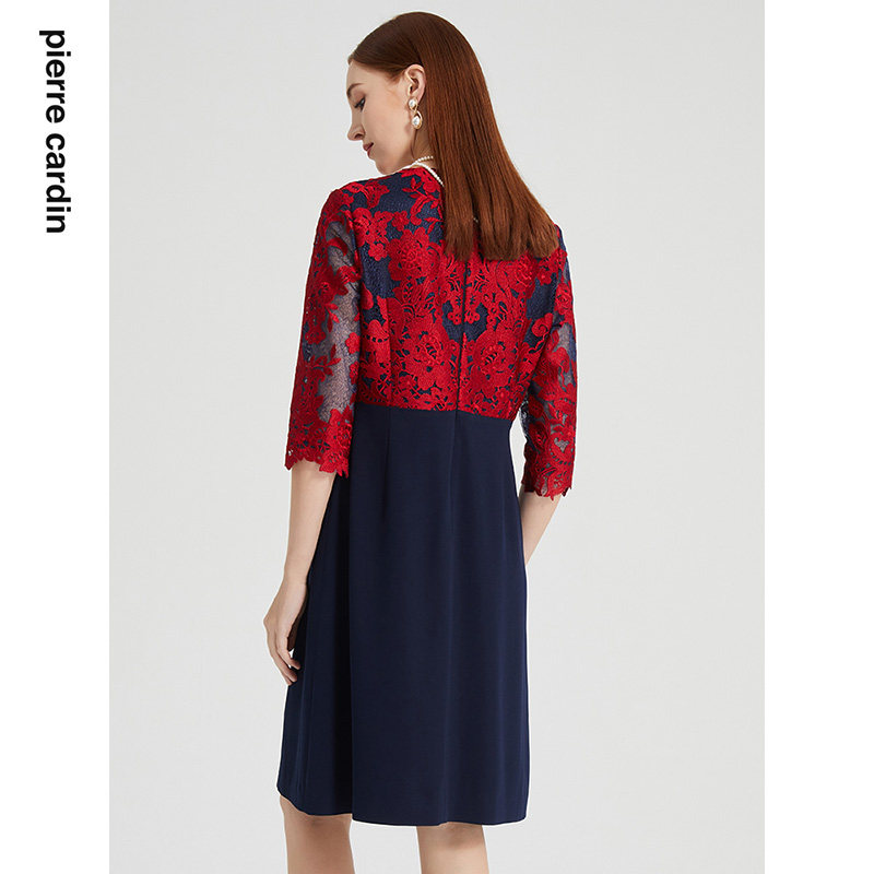 淘宝商场同款皮尔卡丹女装春季新款法式蕾丝刺绣修身连衣裙