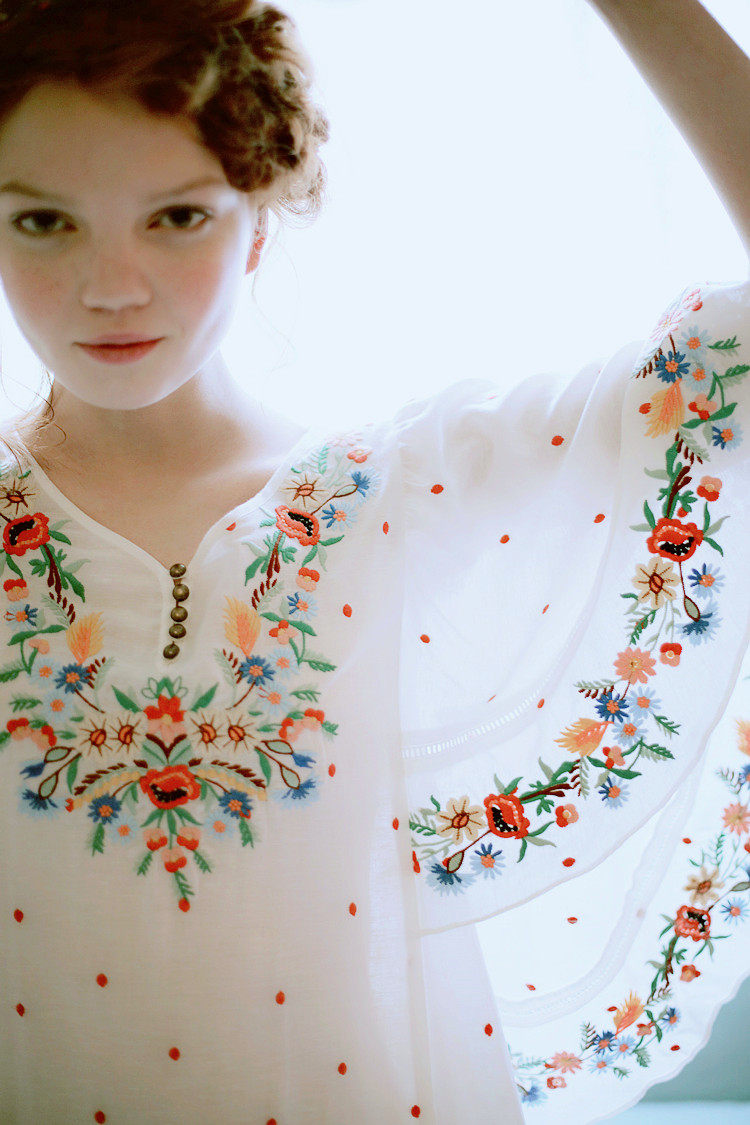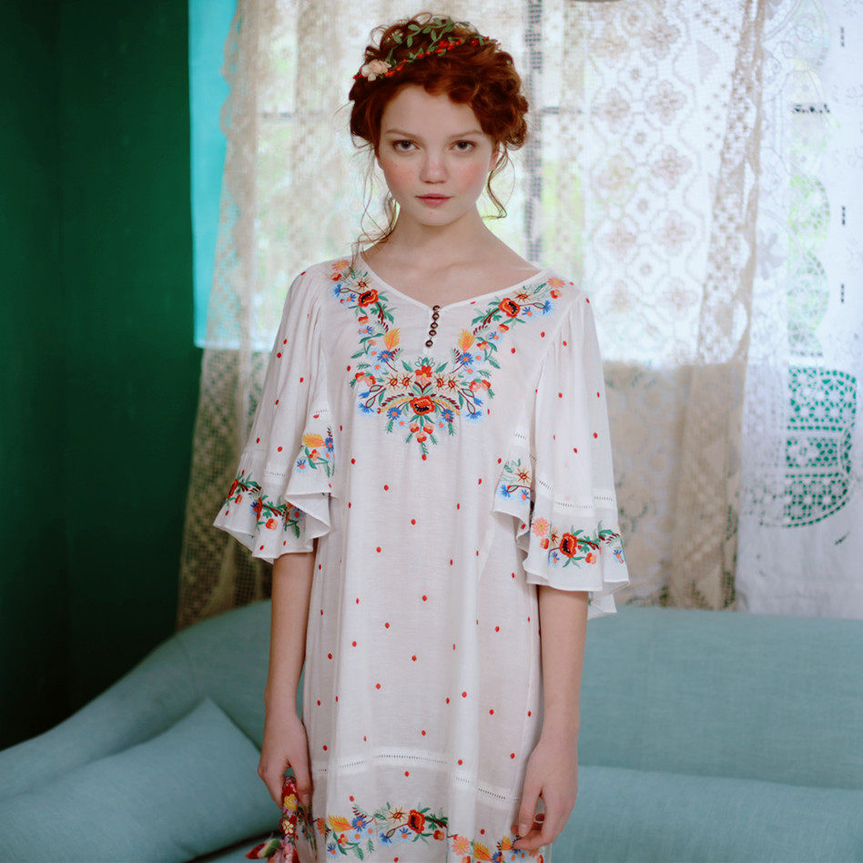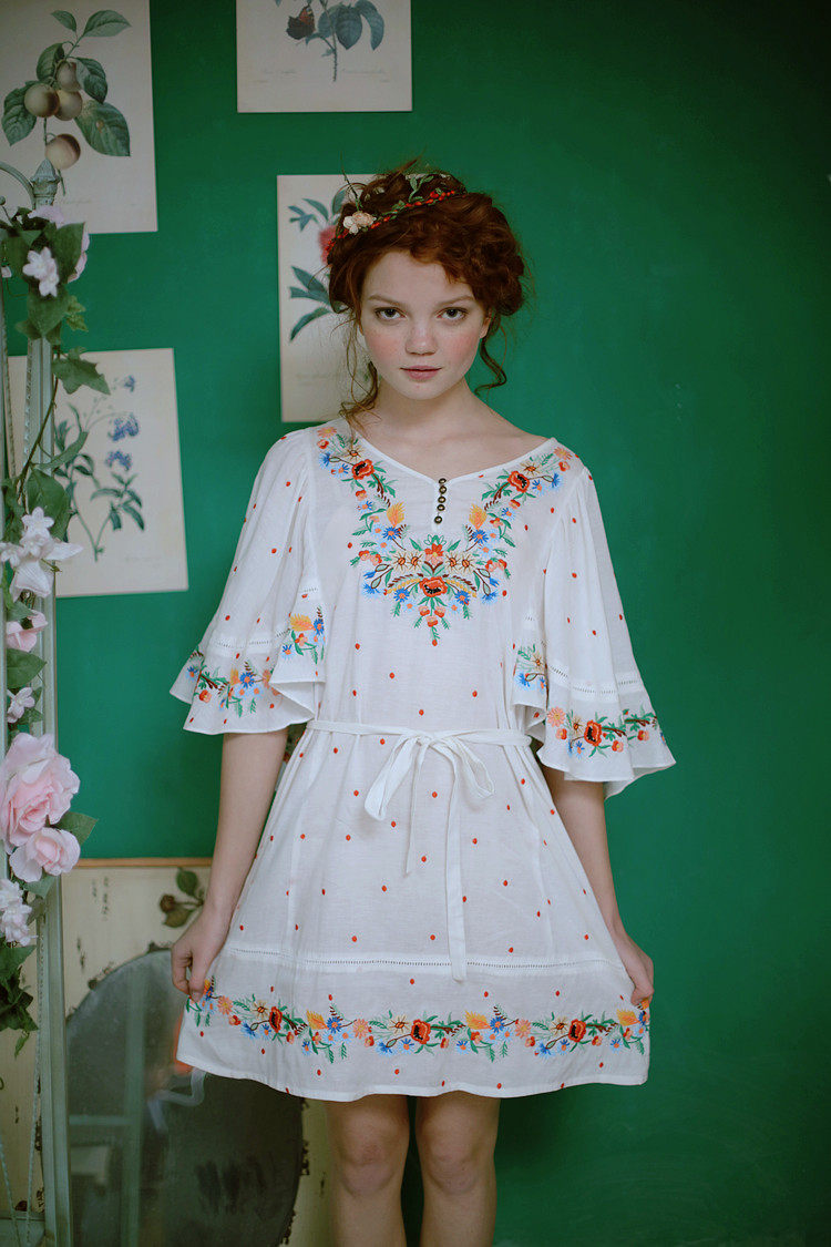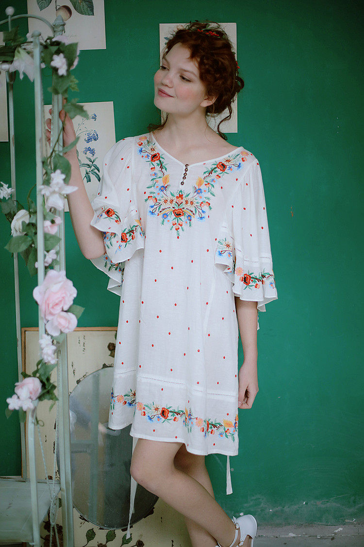 淘宝脸儿艺 森女复古刺绣花水玉圆点蝴蝶喇叭袖宽松棉麻连衣裙