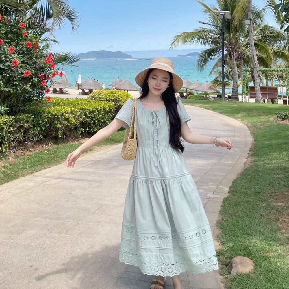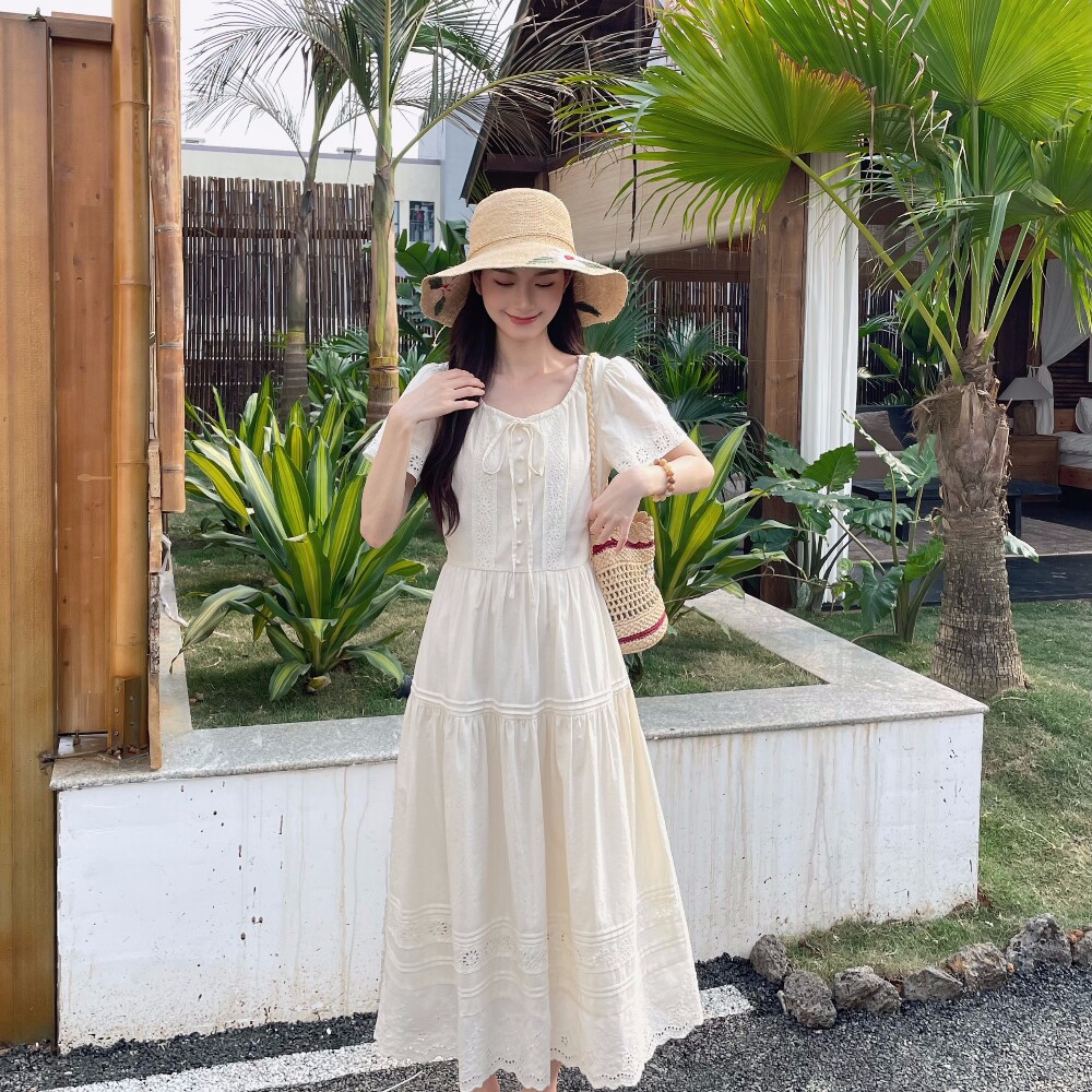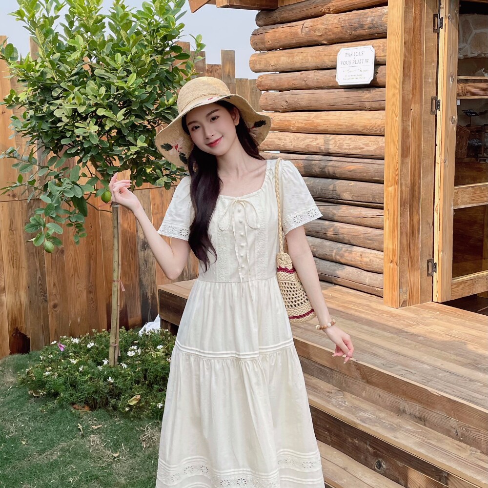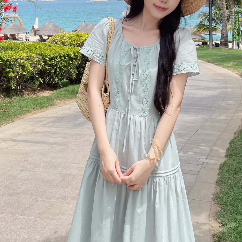 淘宝MOBAI默白【夏有森光】法式复古拼接蕾丝圆领连衣裙女夏显瘦长裙