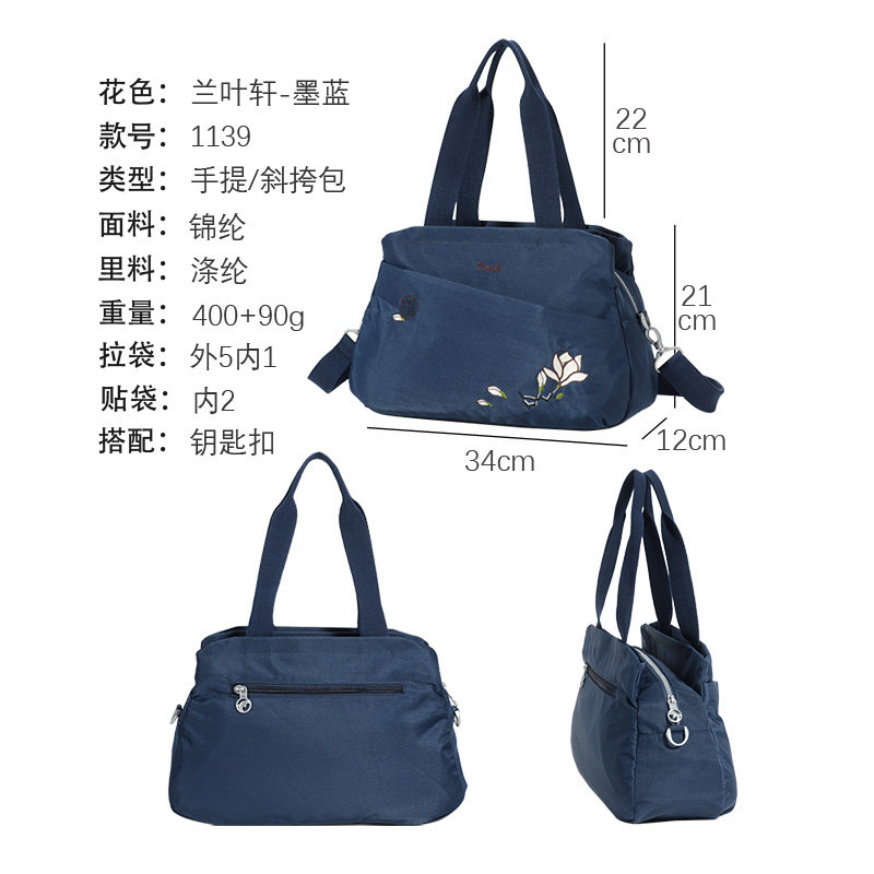 法姿女包大容量刺绣防水时尚尼龙布斜挎包,融合欧式休闲风格与现代潮流设计,兼具实用与美观。采用高品质防水尼龙面料,轻盈耐磨,日常出行无惧雨水侵袭。包身精致刺绣点缀,增添优雅气质,彰显独特品味。大容量主袋搭配多隔层设计,轻松收纳手机、钱包、化妆品等随身物品,满足通勤、购物、旅行等多种场景需求。可调节肩带支持斜挎、单肩多种背法,舒适便捷。简约而不失细节的设计,轻松搭配各类服饰,是都市女性追求时尚与实用并重的理想选择。