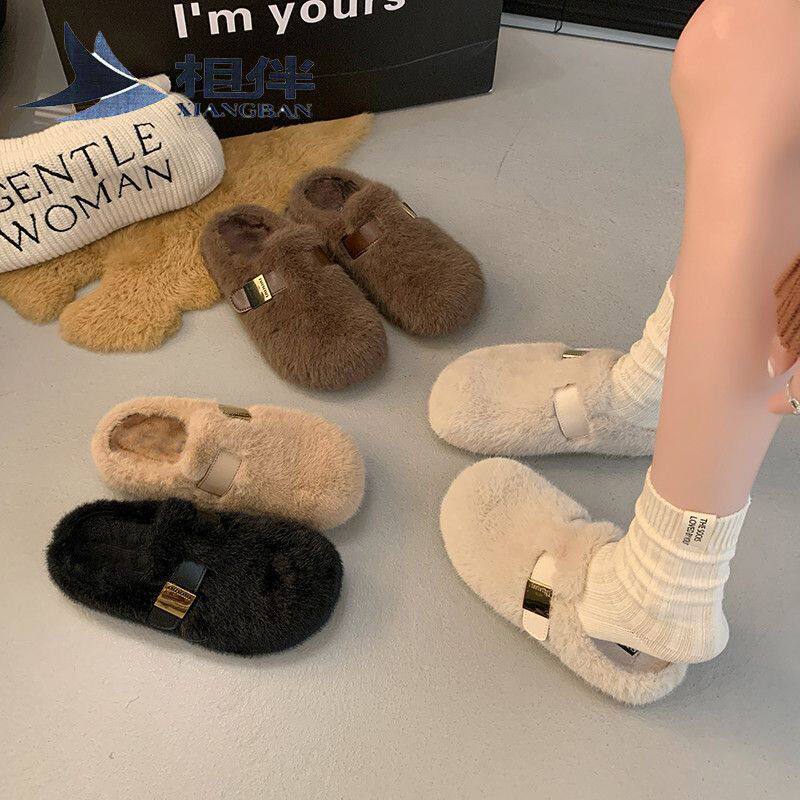 淘宝小众皮扣毛毛鞋拖鞋女鞋子外穿新款秋冬季复古加绒棉鞋包头半拖鞋