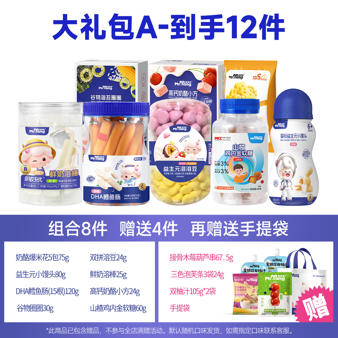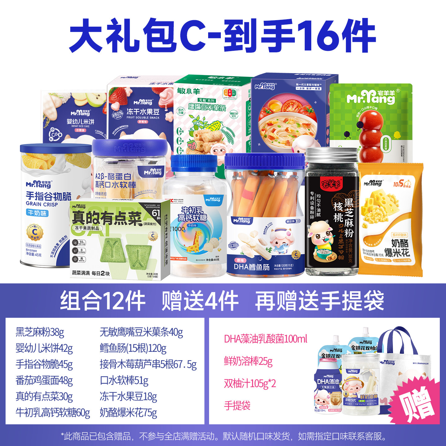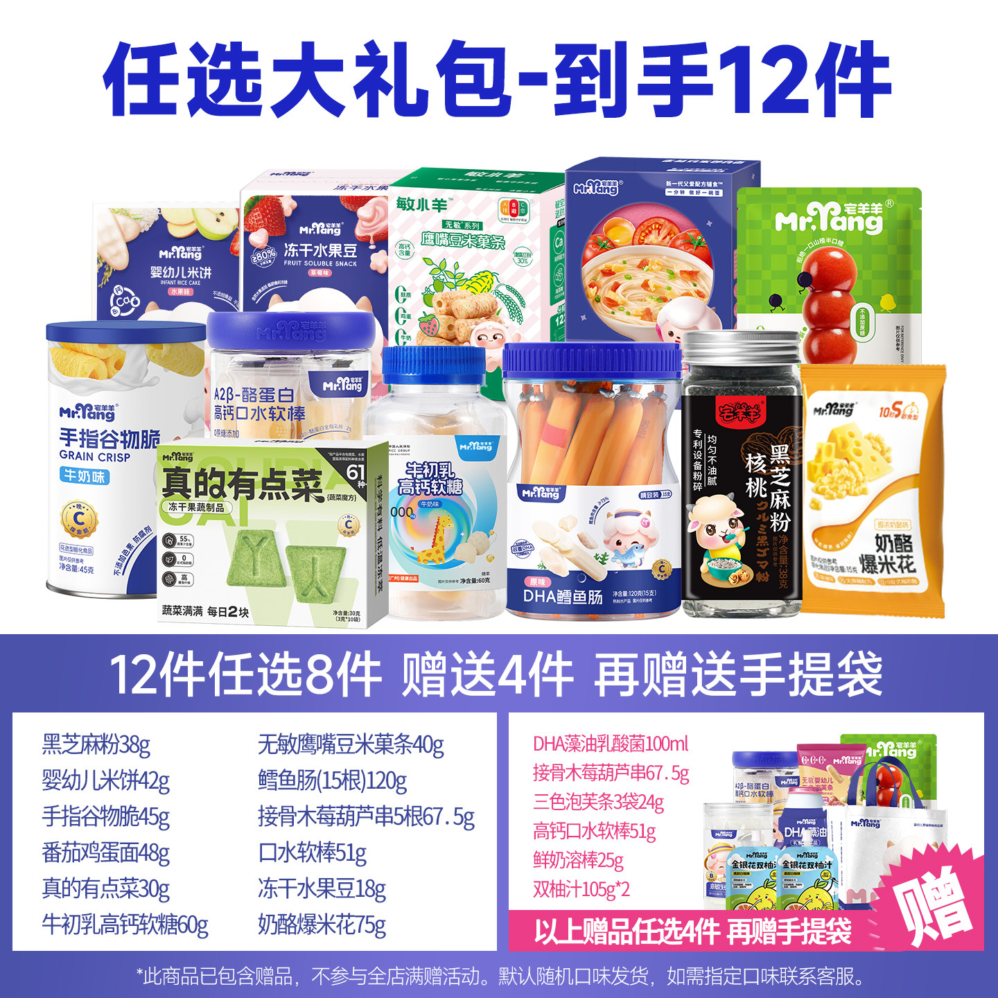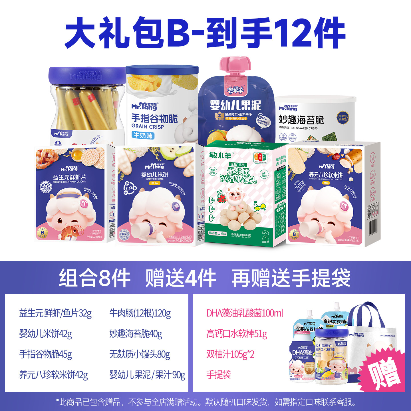 【98任选】宅羊羊宝宝零食大礼包,专为婴幼儿精心打造,包含磨牙棒、米饼等多种健康辅食。严选优质原料,无添加防腐剂、香精、色素,呵护宝宝娇嫩肠胃。磨牙棒质地适中,帮助缓解出牙不适;米饼酥脆易溶,锻炼抓握与咀嚼能力。每款产品均通过严格质检,符合国家婴幼儿食品标准,安全放心。包装可爱童趣,方便携带,是居家、出行必备之选。98元任选组合,性价比超高,让宝宝吃得开心,妈妈更安心。宅羊羊,陪伴宝宝健康成长每一天!