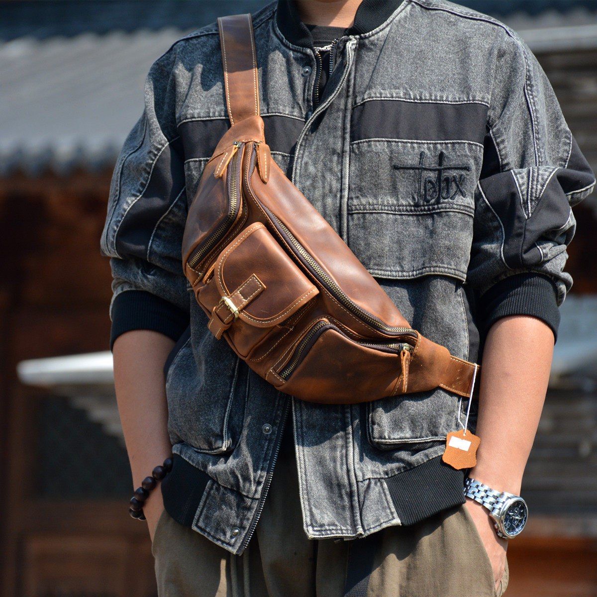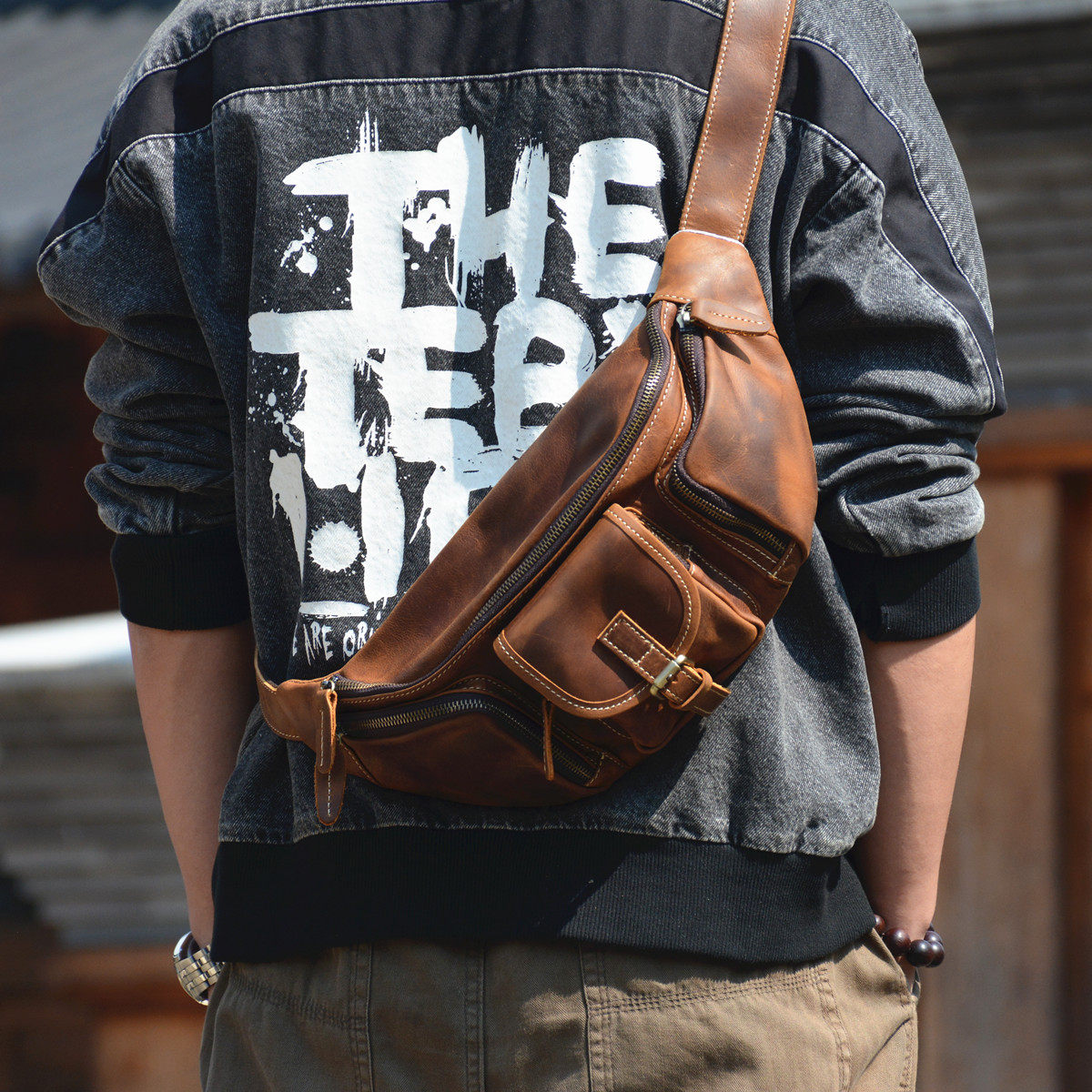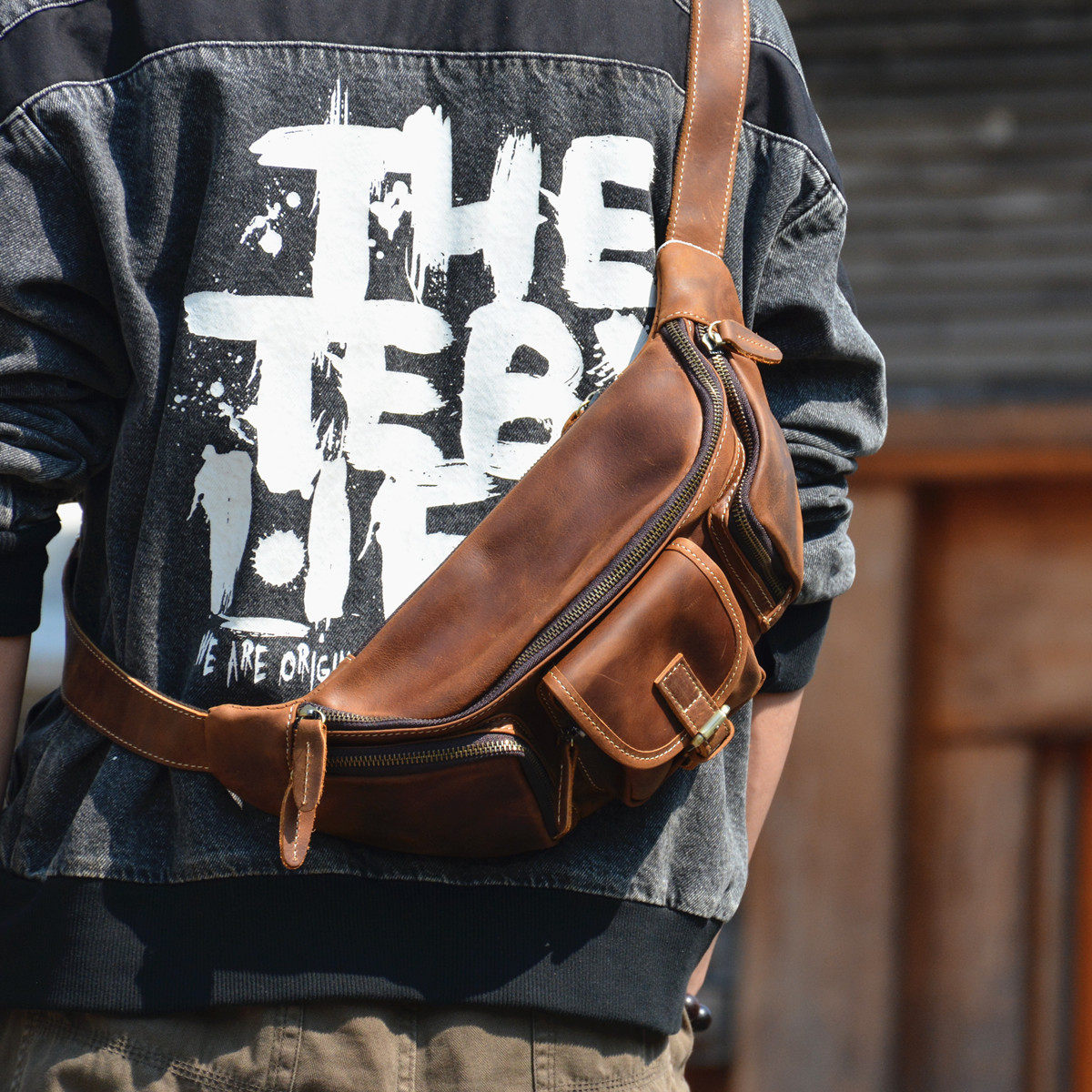 这款原创牛皮男士腰包,采用进口疯马皮精工打造,经做旧工艺处理,呈现独特复古质感,尽显机车风格硬汉气质。包身结实耐用,纹理自然,随使用时间推移愈发温润有型。多功能设计兼顾实用与时尚,可斜挎、胸背或腰挂,轻松应对通勤、旅行、户外等场景。内部结构合理,分层收纳井然有序,满足日常收纳需求。真皮材质搭配金属扣件,细节考究,彰显品质。无论是搭配工装、休闲或潮流穿搭,都能轻松驾驭,是追求个性与质感的男士理想之选。复古而不失现代感,实用与型格兼具。