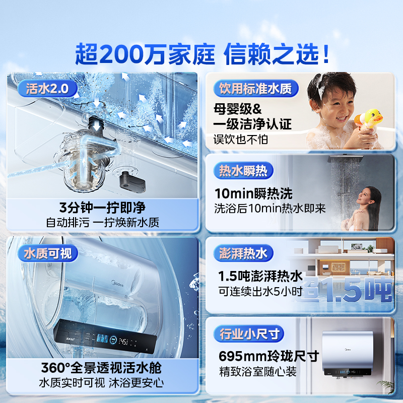 天猫美的活水2.0电热水器UD10MAX双胆扁桶洗澡家用一级家电UD10Ultra