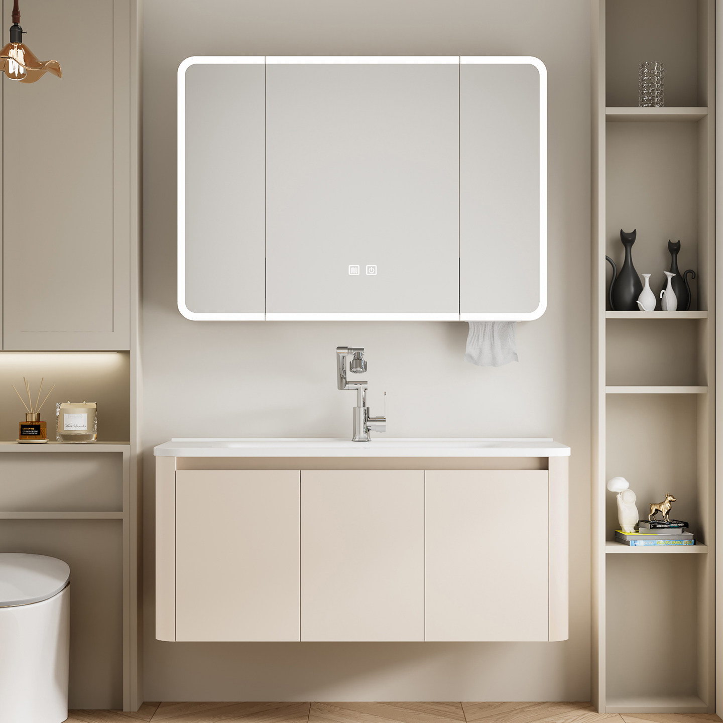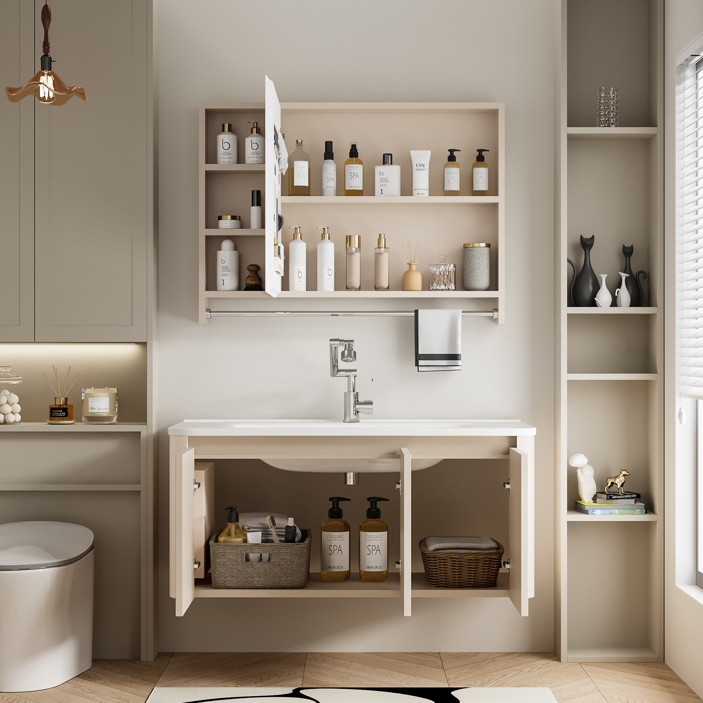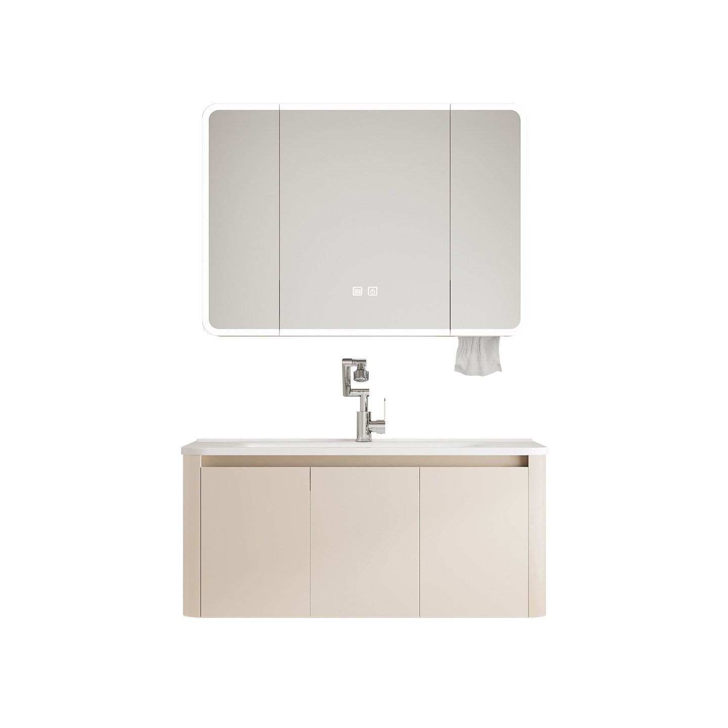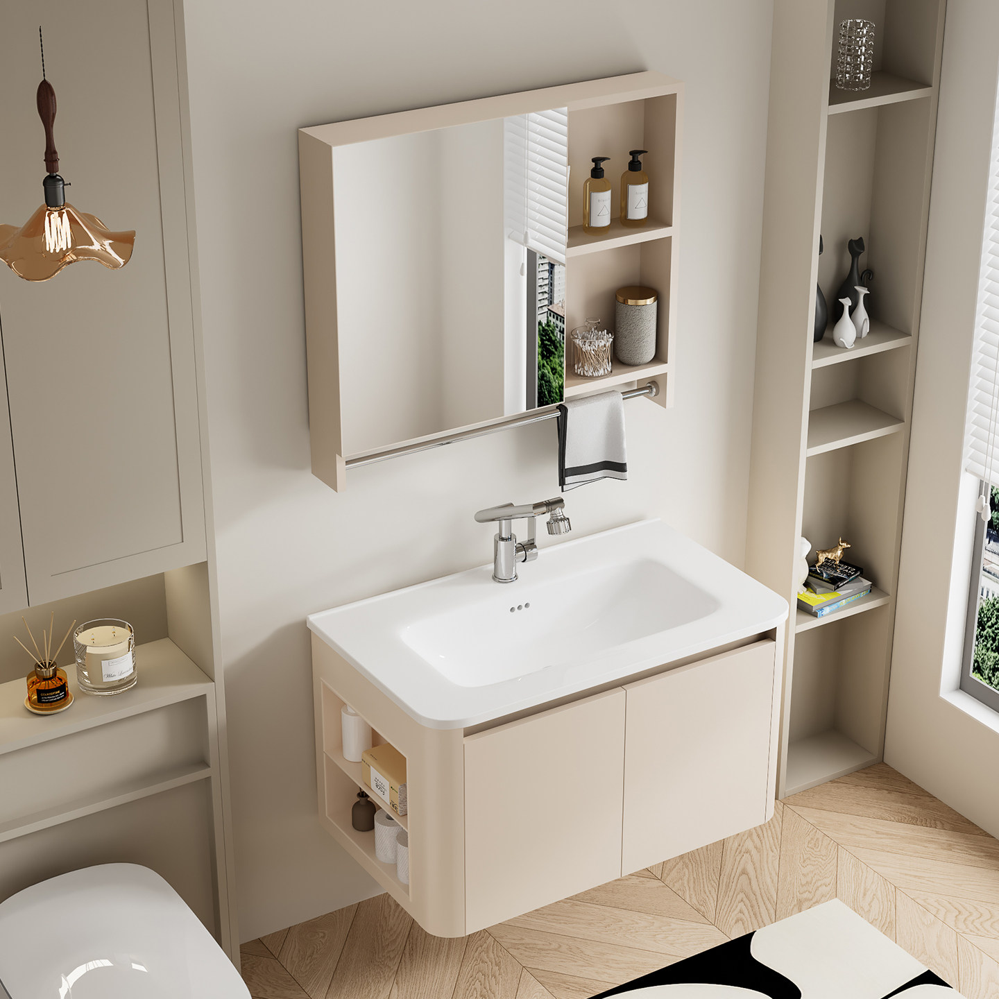 这款奶油风加厚蜂窝太空铝浴室柜,融合现代简约与实用美学,采用高强度蜂窝结构太空铝材质,防潮防腐、坚固耐用,有效延长使用寿命。柜体表面采用温润奶油白色调,质感细腻,营造温馨舒适的卫浴空间。搭配陶瓷一体成型洗脸盆,无缝设计易清洁,美观大方。侧柜设计合理收纳,满足日常洗漱用品存放需求。整体结构稳固,适配多种卫生间布局,尤其适合小户型或追求高颜值与功能性兼具的家庭。加厚边框增强承重能力,静音铰链开合顺滑,是集美观、环保、实用于一体的优质卫浴选择。