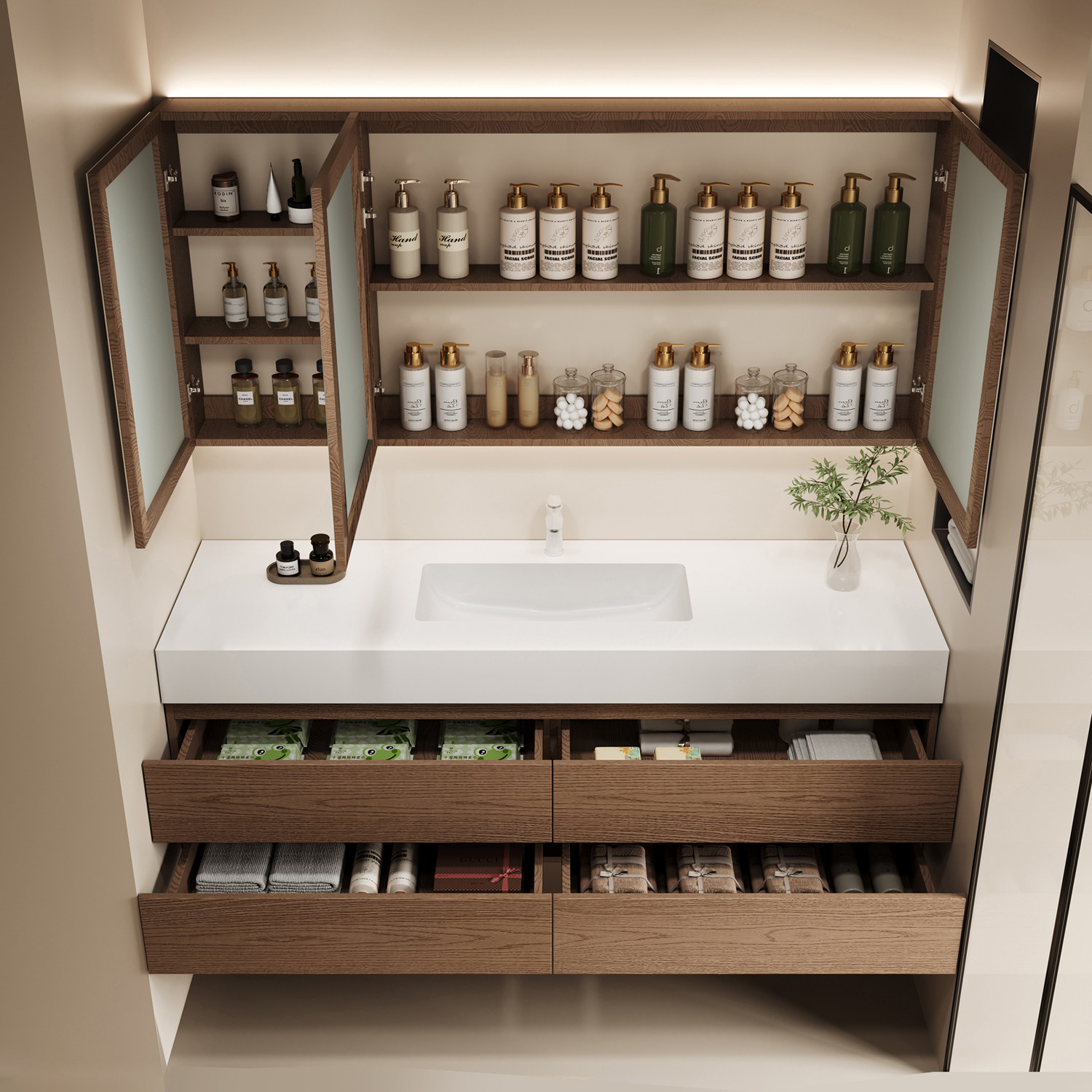 万和浴室柜组合奶油风实木一体陶瓷盆现代简约洗脸洗手盆柜洗漱台