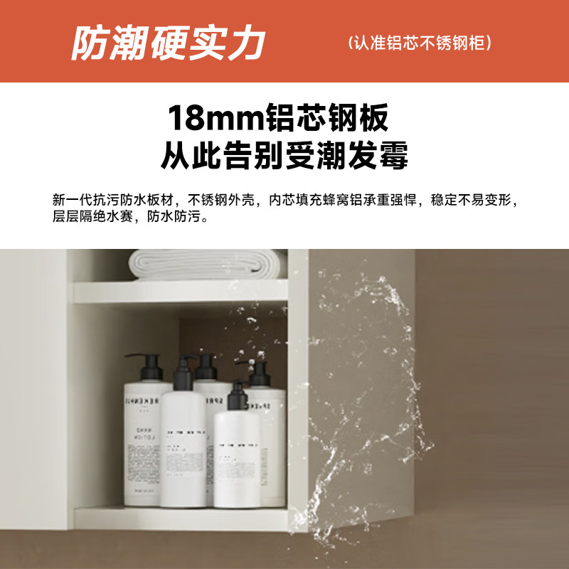 恒洁6106不锈钢铝合金浴室柜组合,采用优质不锈钢与高强度铝合金框架,结构稳固、防潮耐腐蚀,经久耐用。搭配陶瓷一体成型盆,表面光滑细腻,易清洁、抗污性强,有效防止细菌滋生。简约现代设计,线条流畅,适配多种卫浴风格。台下盆设计节省空间,搭配大容量储物柜,满足日常洗漱用品收纳需求。安装便捷,密封性好,有效防漏。恒洁品牌保障,品质可靠,是提升浴室功能与美观的理想之选,兼顾实用性与高颜值,为现代家庭打造舒适洁净的洗漱体验。