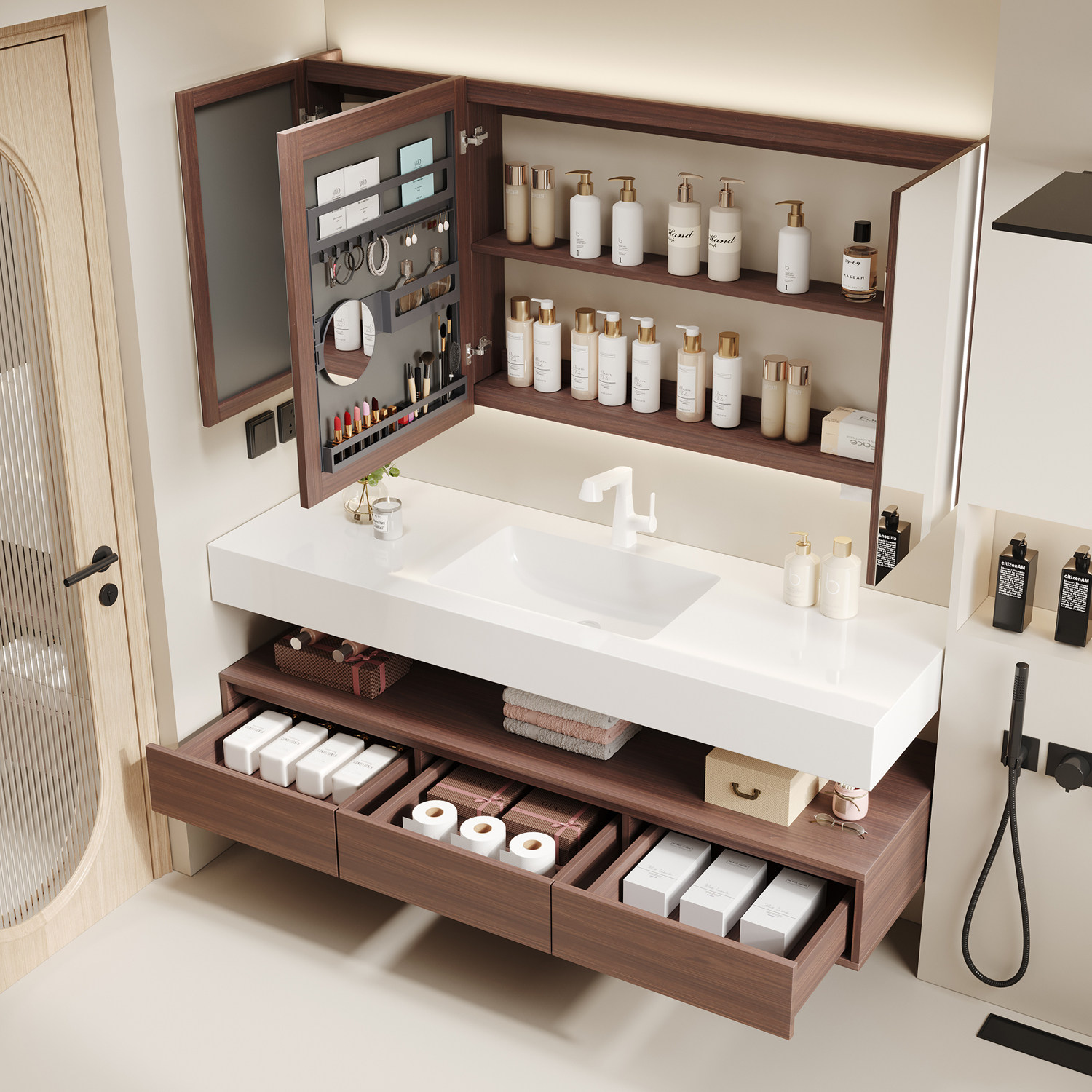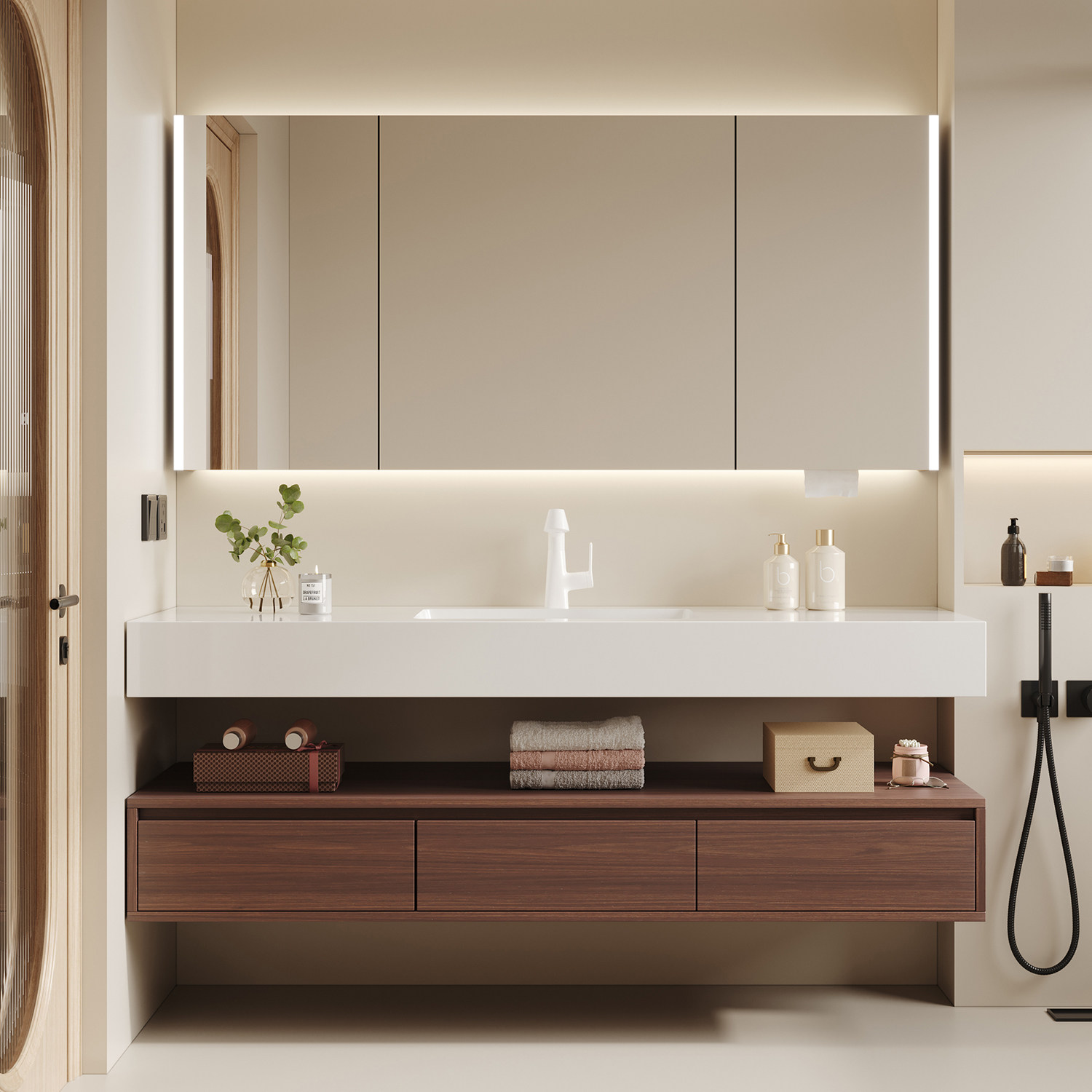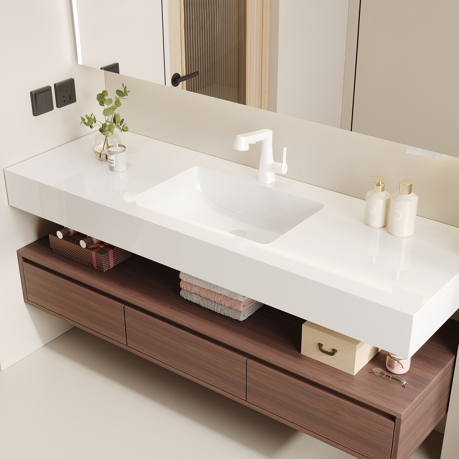 惠达酒店风岩板陶瓷无缝盆浴室柜组合,融合现代简约设计与实用功能,专为高端卫浴空间打造。采用高品质岩板台面,耐磨抗污、触感温润;搭配一体成型陶瓷无缝盆,杜绝藏污纳垢,清洁更便捷。柜体结构稳固,储物空间合理分区,满足日常洗漱用品收纳需求。整体风格大气雅致,线条流畅,适配多种装修风格,尤其适合追求品质生活的家庭或精品酒店使用。安装便捷,防水防潮性能优异,持久耐用,是提升卫生间格调与实用性的理想之选。
