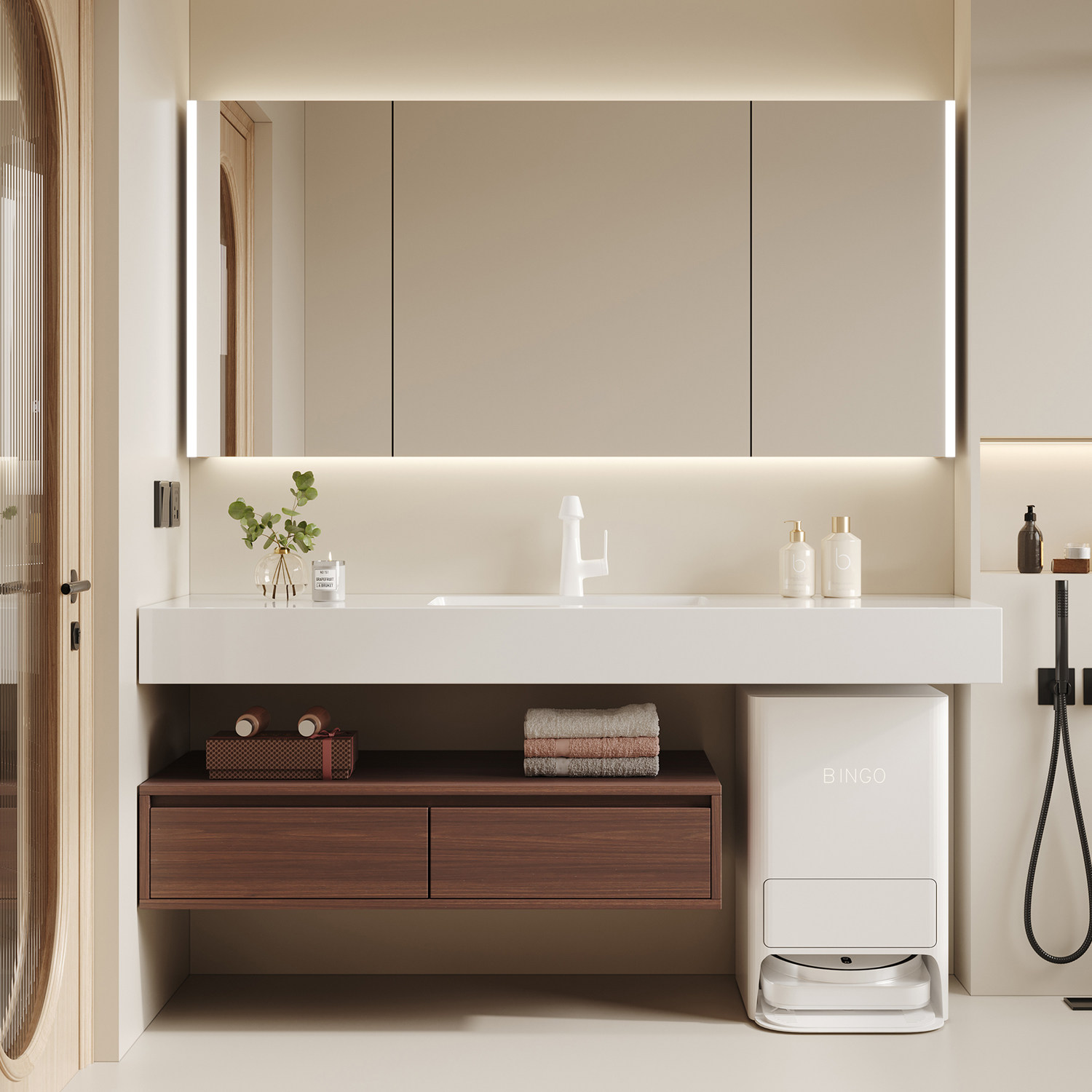 万和浴室柜组合奶油风实木一体陶瓷盆现代简约洗脸洗手盆柜洗漱台