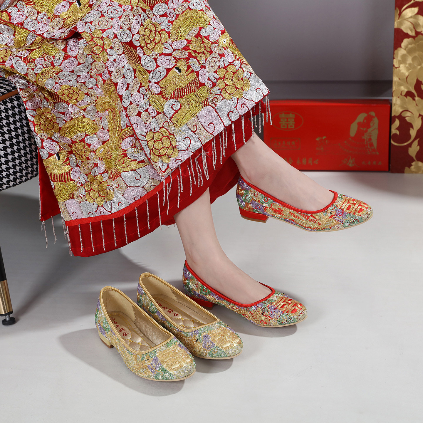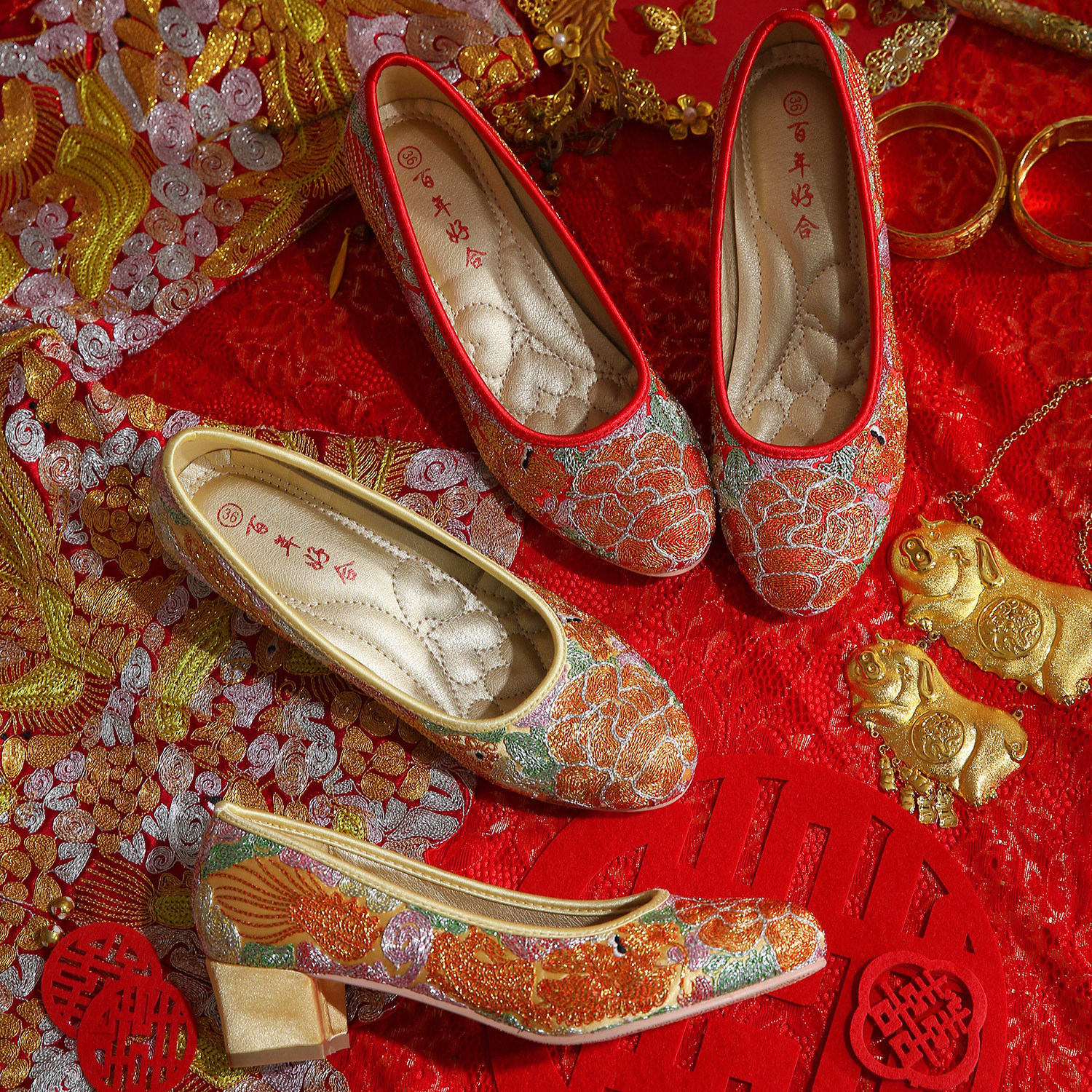 这款中式中跟婚鞋以喜庆吉祥的红色为主调,鞋面精工刺绣龙凤呈祥图案,寓意夫妻恩爱、百年好合。采用传统手工工艺,针脚细密,色彩饱满,尽显东方韵味。中跟设计兼顾美观与舒适,适合长时间穿着,搭配旗袍、裙褂或秀禾服等传统婚嫁礼服相得益彰。粗跟稳固防滑,提升行走安全性,让新娘在婚礼当天优雅从容。整体造型典雅大气,既传承中华文化精髓,又契合现代审美,是中式婚礼中不可或缺的点睛之笔,完美诠释东方新娘的温婉与华贵。