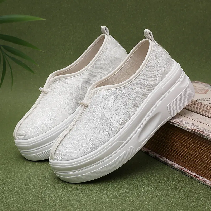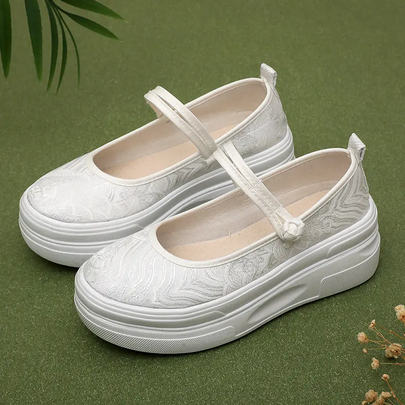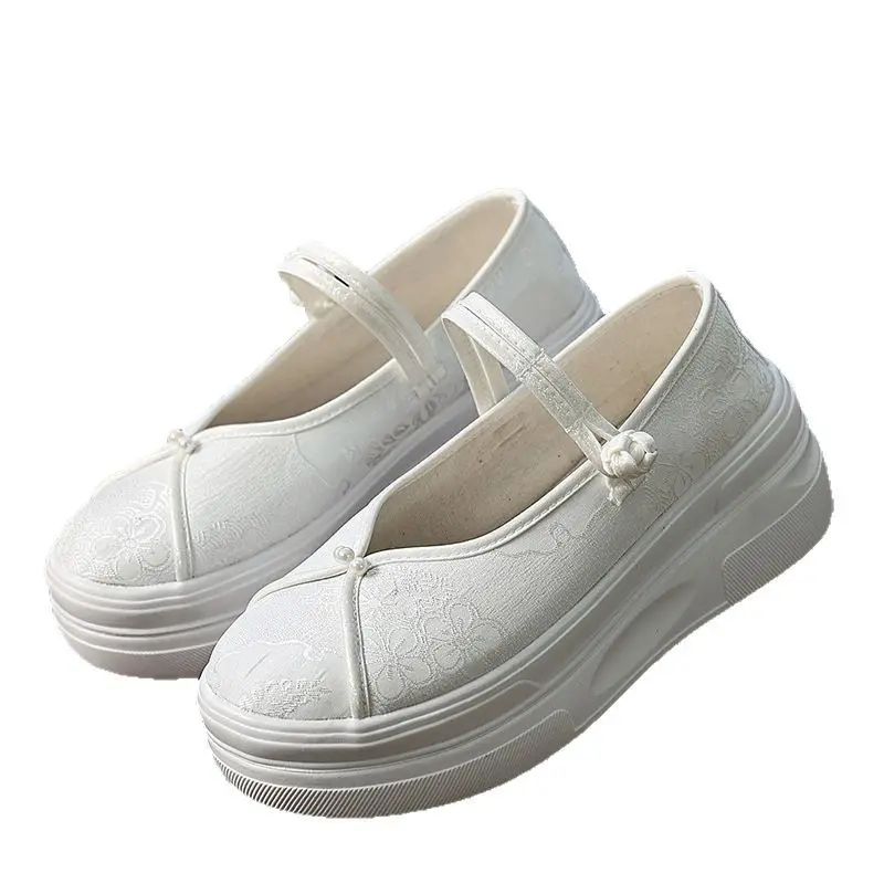 2024春秋新款古风松糕厚底汉服鞋,融合传统与现代美学,专为搭配马面裙、茶服等汉服设计。鞋面采用精致手工刺绣,图案雅致,寓意吉祥,展现东方韵味。厚底松糕设计舒适增高,行走稳健,兼顾美观与实用。内里柔软透气,适合长时间穿着。既有传统布鞋的质朴质感,又融入小白鞋的简约百搭风格,轻松驾驭日常出行与雅集活动。无论是搭配明制马面裙,还是宋制茶服,都能凸显温婉气质,是汉服爱好者不可或缺的时尚单品,让古典之美在现代生活中焕发新生。