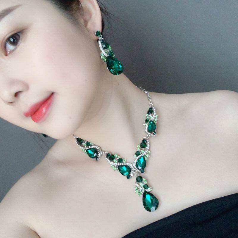 淘宝欧美时尚首饰套链气质百搭水钻蓝宝石项链耳环套装女礼服宴会配饰
