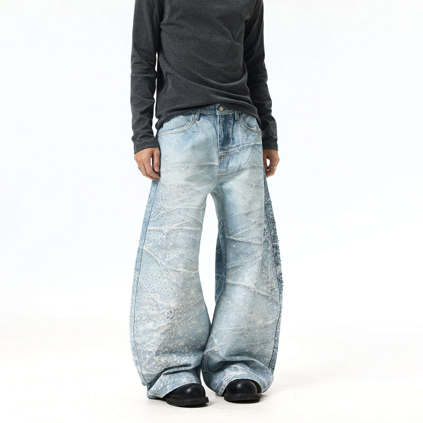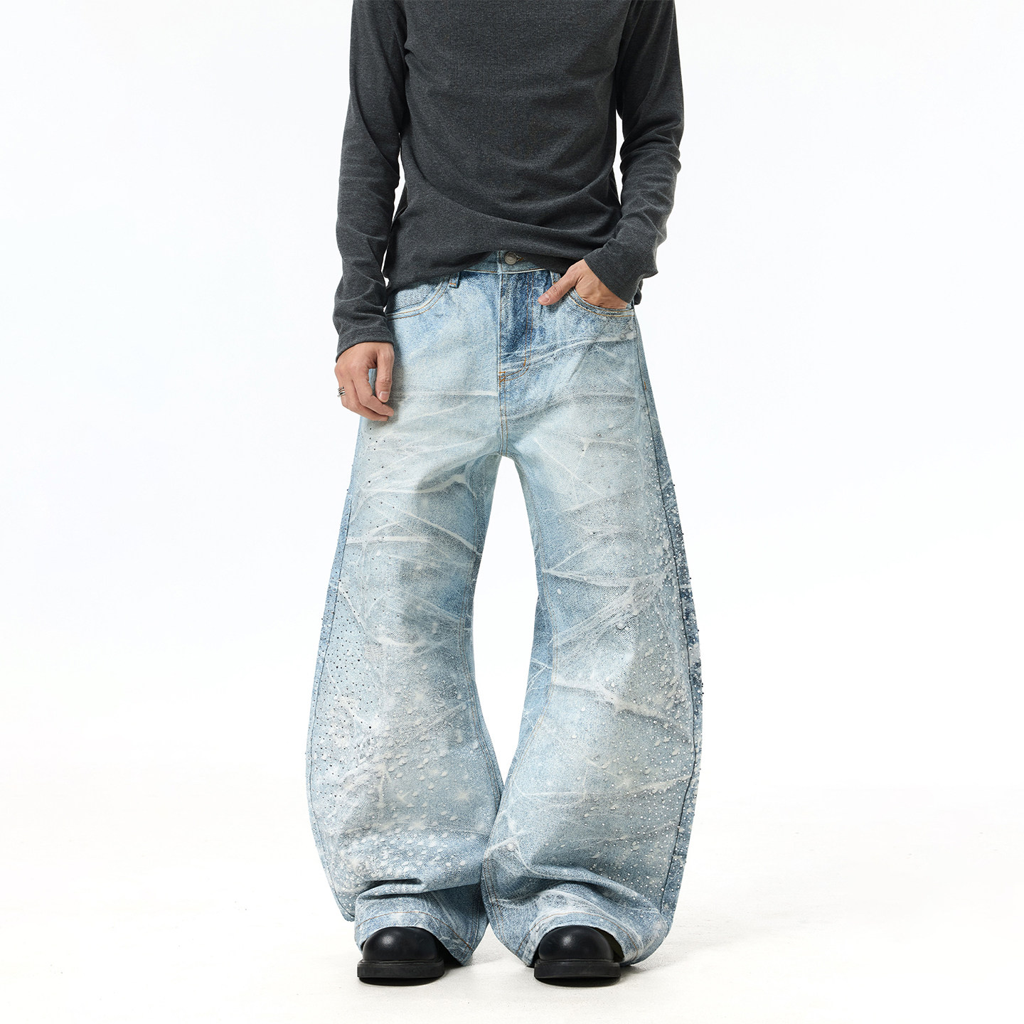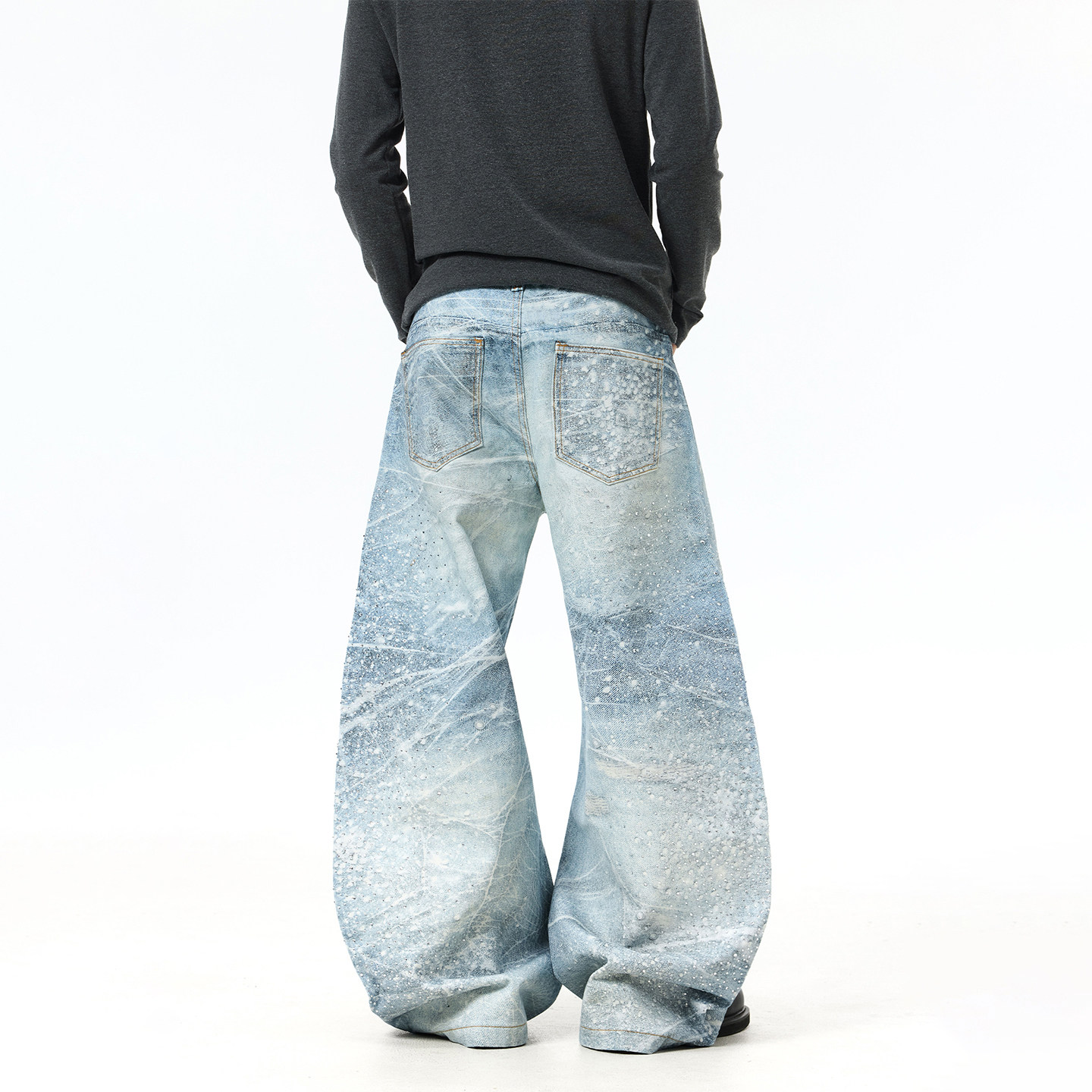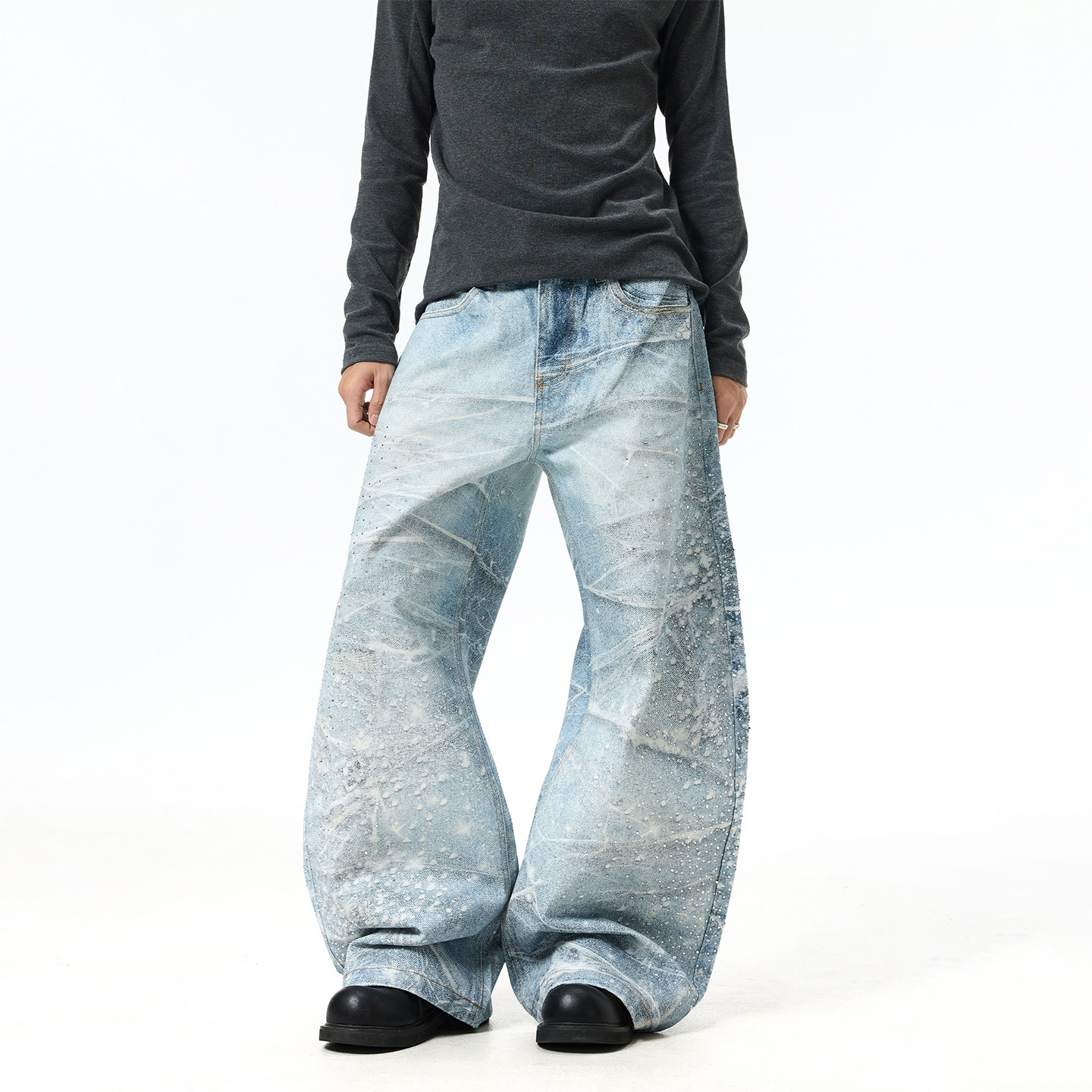 淘宝BTSG复古3D打印烫钻泼墨星光水洗猫须牛仔裤美式廓形阔腿弯刀裤男