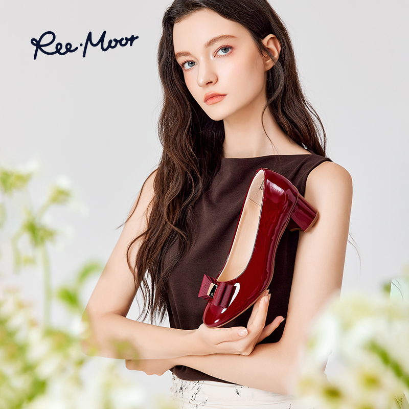 天猫REEMOOR睿慕红色粗高跟新娘婚鞋女软底漆皮单鞋舒适气质小皮鞋