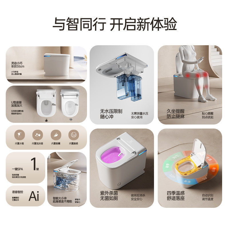 这款智能马桶专为小户型设计,机身长度仅54cm,小巧紧凑,轻松适配各类狭窄卫浴空间。采用一体式流线造型,美观易清洁,无卫生死角。配备全自动感应系统,支持脚感翻盖、离座自动冲水,操作便捷卫生。即热式加热技术,活水瞬间加热,避免储水细菌滋生,节能又健康。突破传统水压限制,内置增压泵确保低楼层或高峰期也能稳定冲洗。座圈恒温加热、多档水温调节、暖风烘干及除臭功能一应俱全,带来舒适如厕体验。静音缓降盖板,夜间使用不扰人。集智能、节水、舒适于一体,是小户型升级卫浴生活的理想之选。