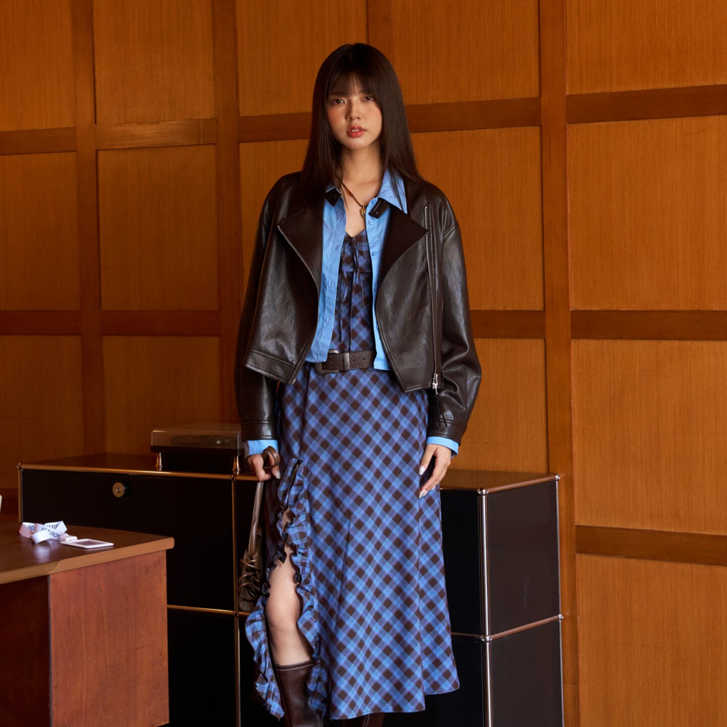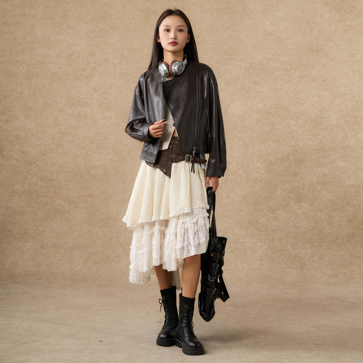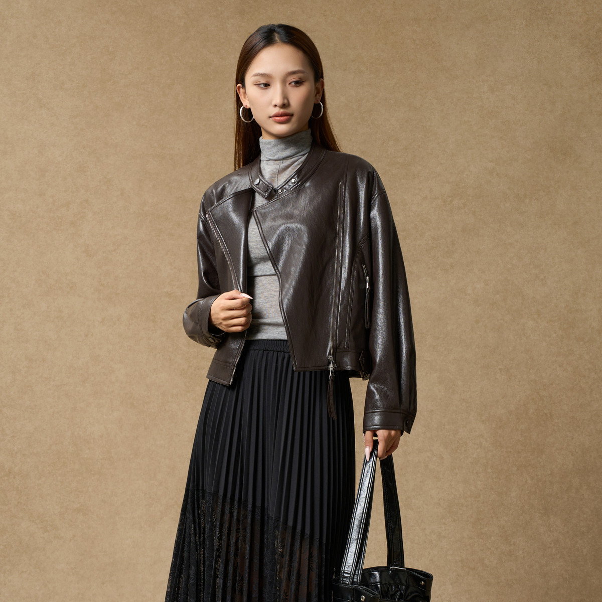 西町村屋2025秋季新款女装短款皮衣(款号:XXAC10003),以机车风为灵感,融合都市潮流与复古格调,打造率性 chic 的秋季穿搭。采用优质环保皮革,质感挺括且触感细腻,短款剪裁凸显腰线,轻松拉长腿部比例。不对称拉链、金属铆钉与立体口袋设计,细节中彰显个性态度。内里加绒处理,兼顾保暖与舒适,适合初秋微凉时节。多色可选,百搭黑、焦糖棕等经典色调,轻松驾驭街头、通勤或约会场景。无论是搭配牛仔裤还是连衣裙,都能展现独立自信的女性魅力,是2025秋季不可或缺的时尚单品。