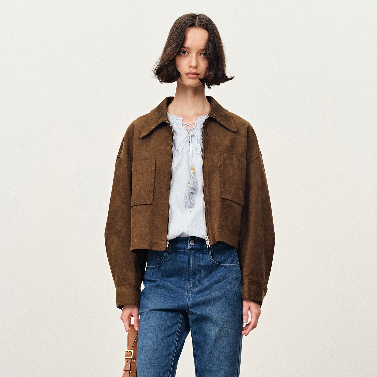IHIMI海谧蛋白皮复古立翻领皮衣短款外套女休闲百搭廓形夹克上衣