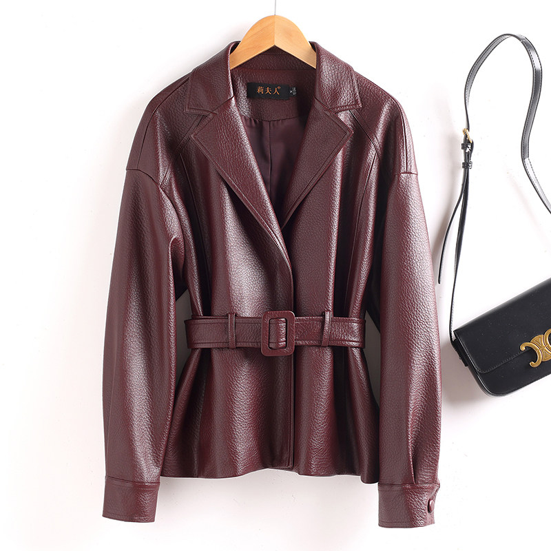 淘淘么淘 明星同款!進口绵羊皮荔枝纹立领皮衣外套女新款+腰带
