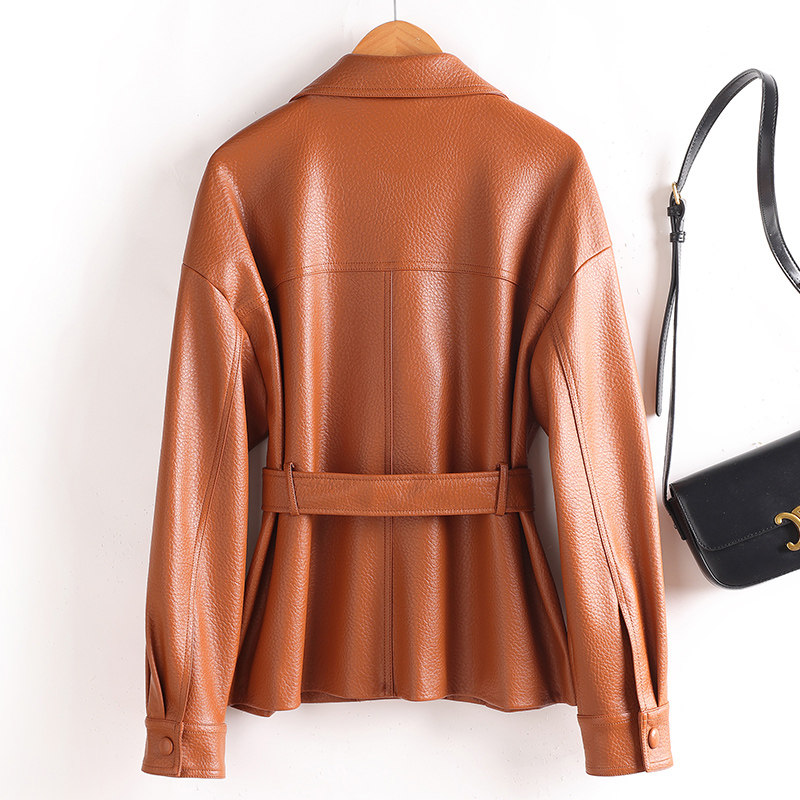 天NanaJacqueline春季新款复古翻领收腰皮衣女气质X版型双排扣外套