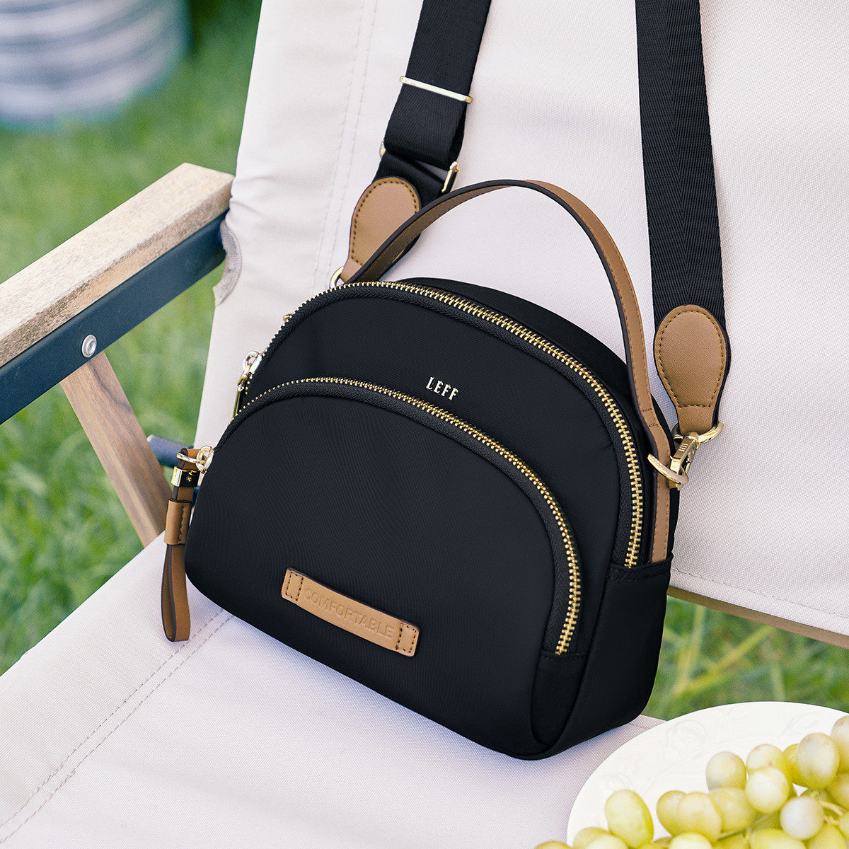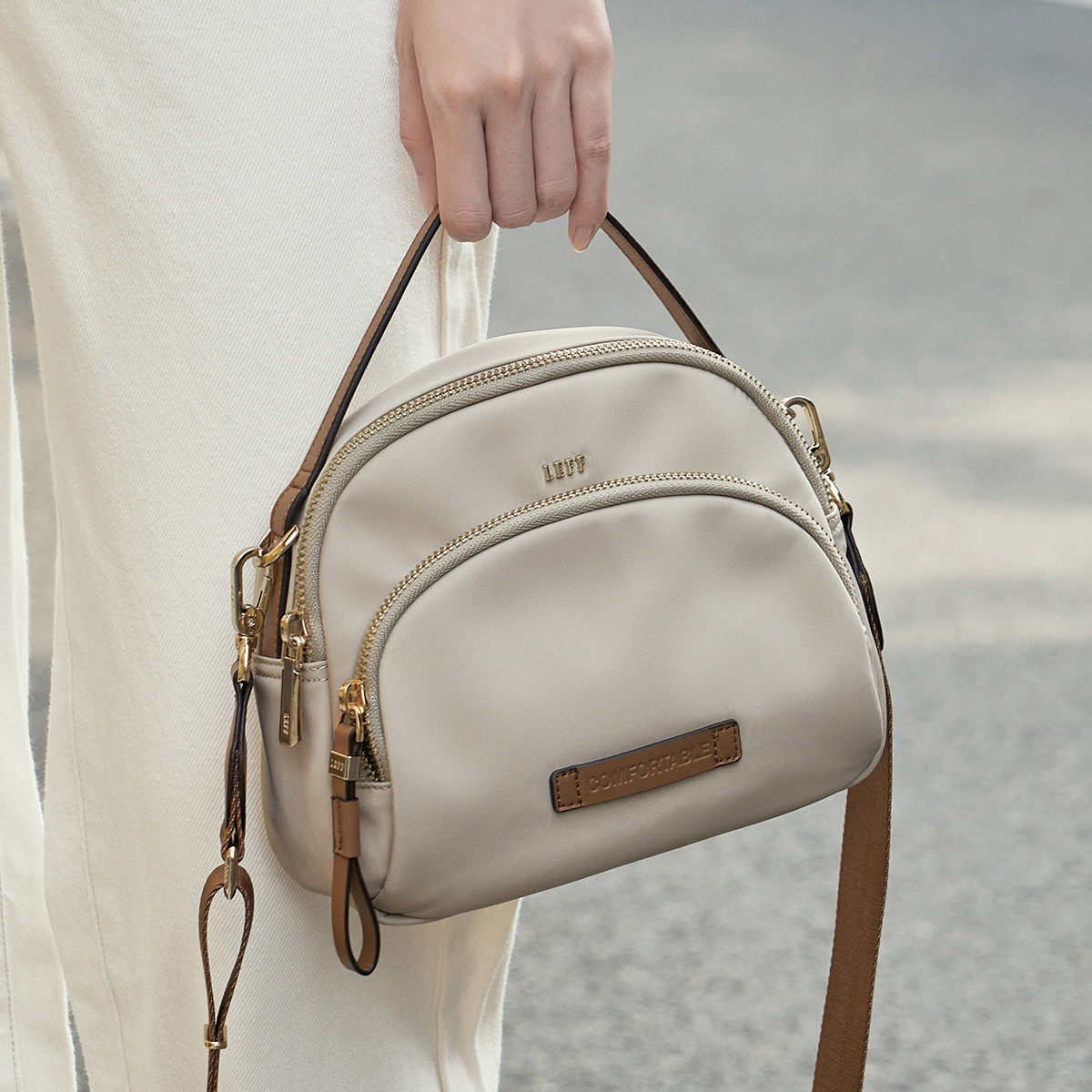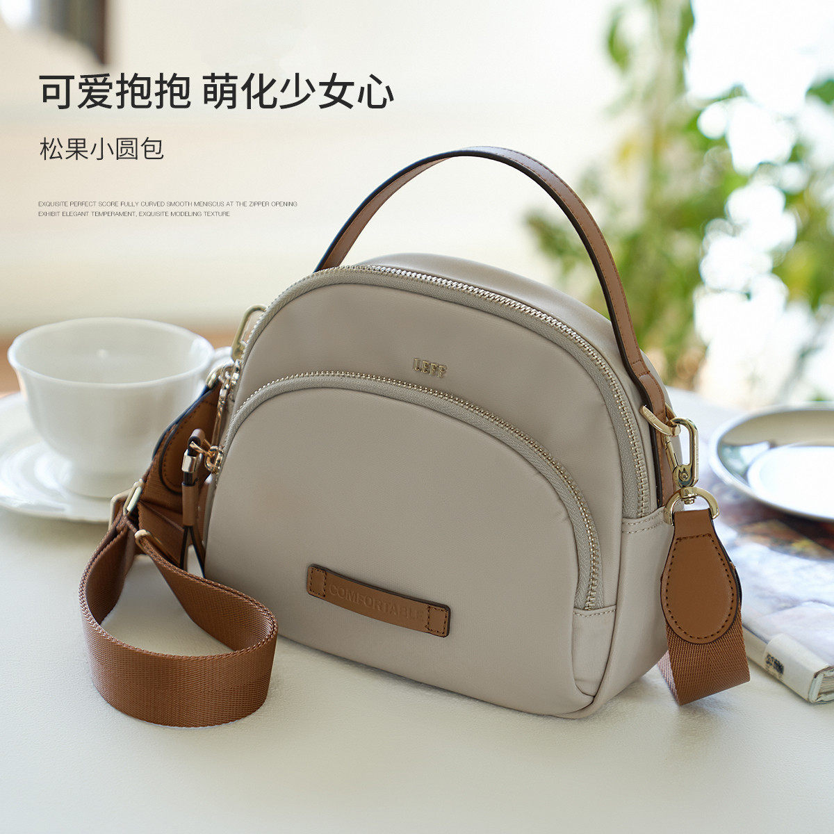 莱夫松果小圆包2026新款,以简约设计融合实用美学,采用高品质尼龙帆布材质,轻盈耐磨,防水防污,日常出行更安心。小巧圆润包型,容量却不妥协,轻松收纳手机、钱包、口红等随身物品。可调节肩带设计,支持斜挎、单肩或手提多种背法,适配通勤、逛街、旅行等多种场景。经典百搭色系,轻松搭配各类服饰,展现随性时尚态度。细节处匠心考究,拉链顺滑、走线工整,兼顾颜值与品质。无论是日常出街还是短途出行,这款小圆包都是你的理想伴侣,轻便实用,尽显都市轻生活格调。