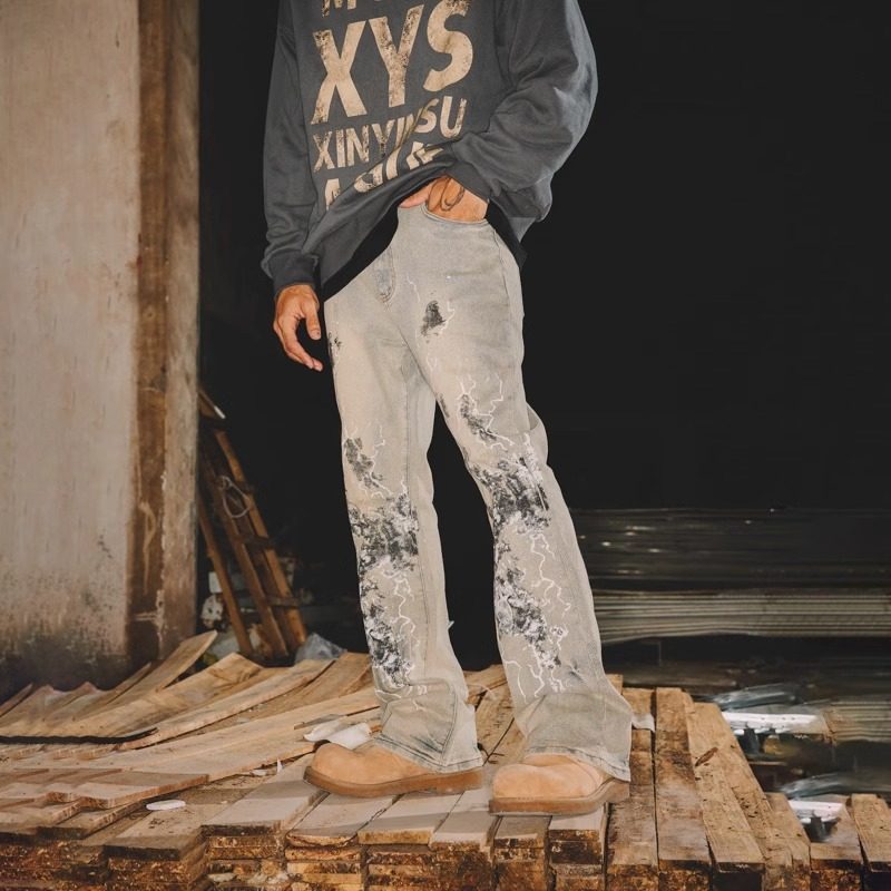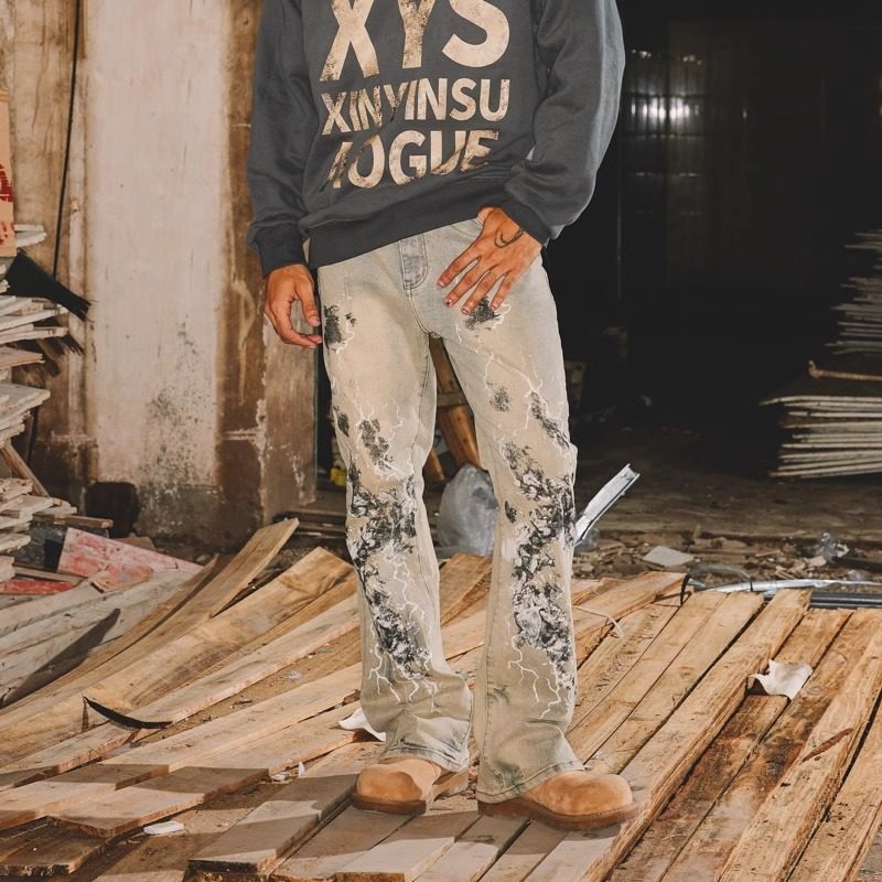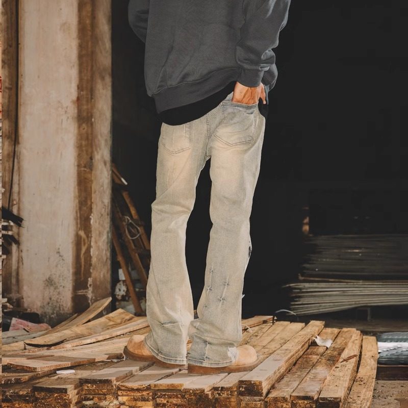 淘美式复古烟灰色微喇牛仔裤男秋季2025新款修身显瘦直筒高街裤子潮