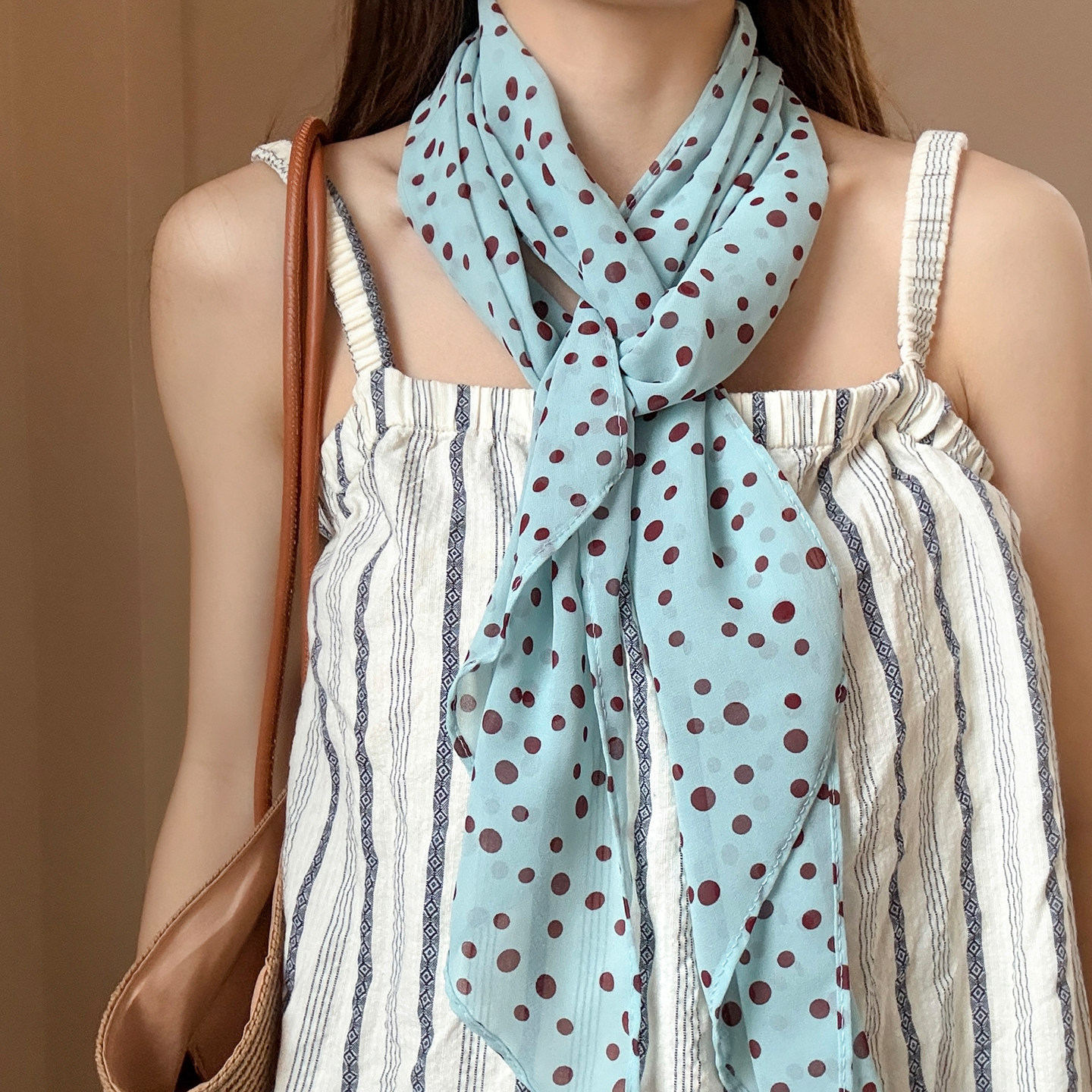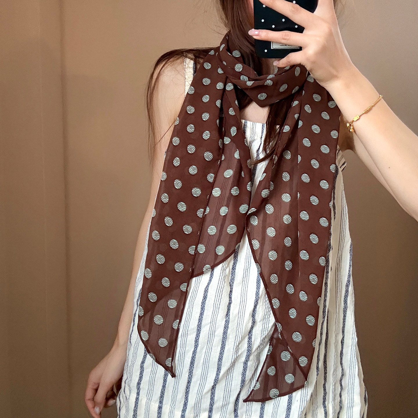 淘棕色波点丝巾印花高级百搭配饰系脖女2026年新款发带绑发长条围巾