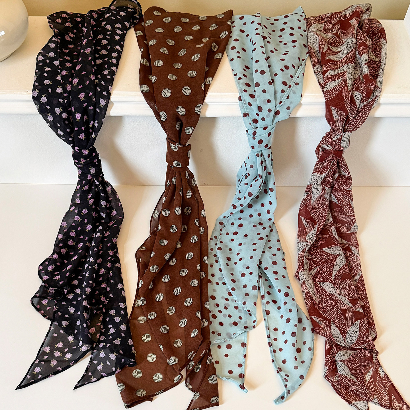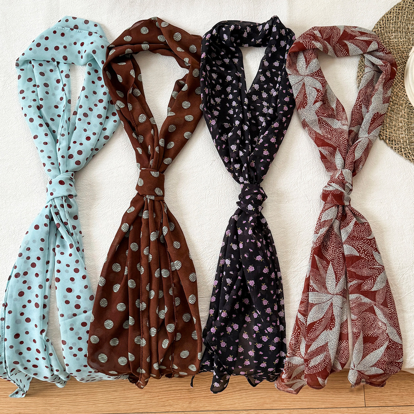 天猫碎花波点长条丝巾系脖女2026新款薄款韩系高级感围脖飘带围巾配饰
