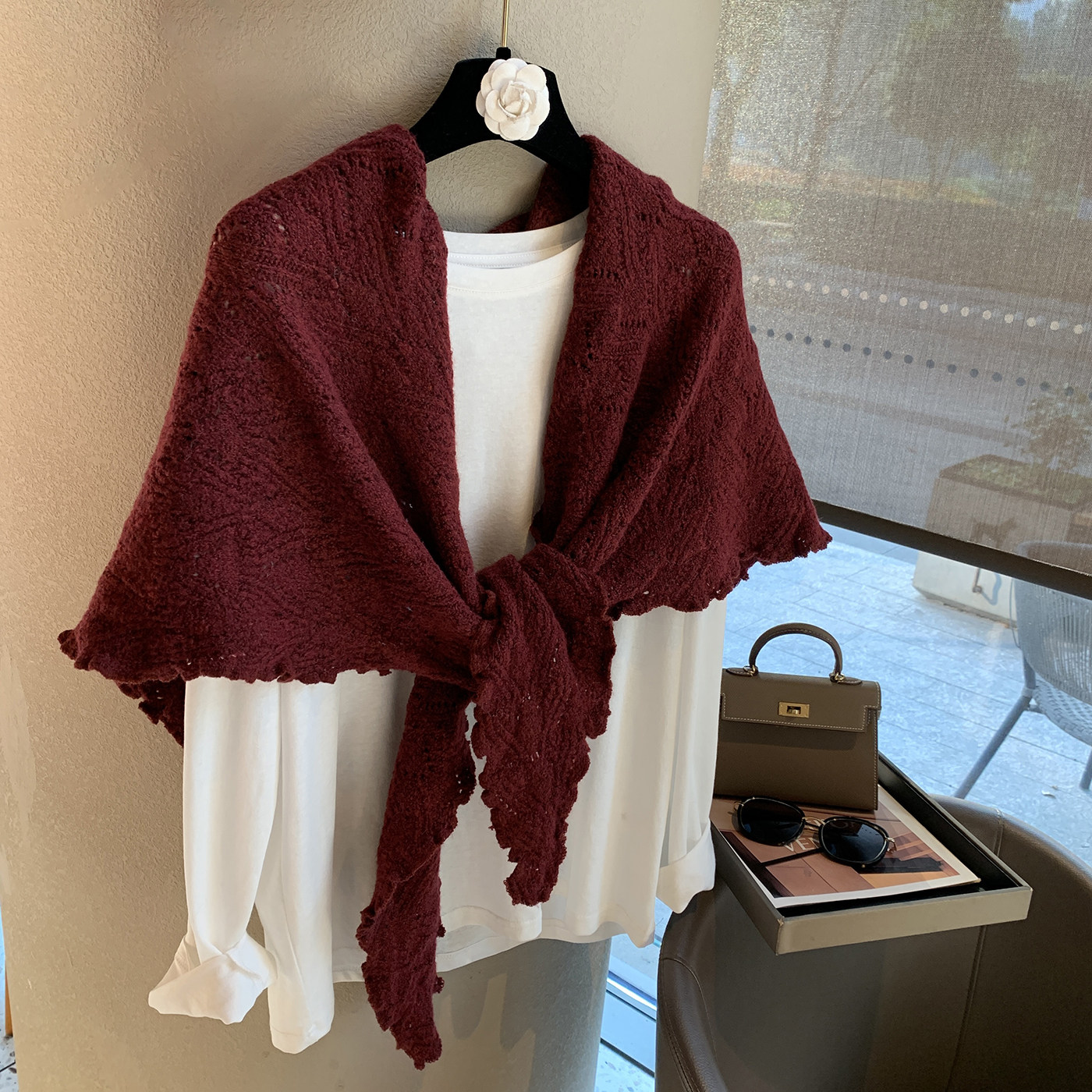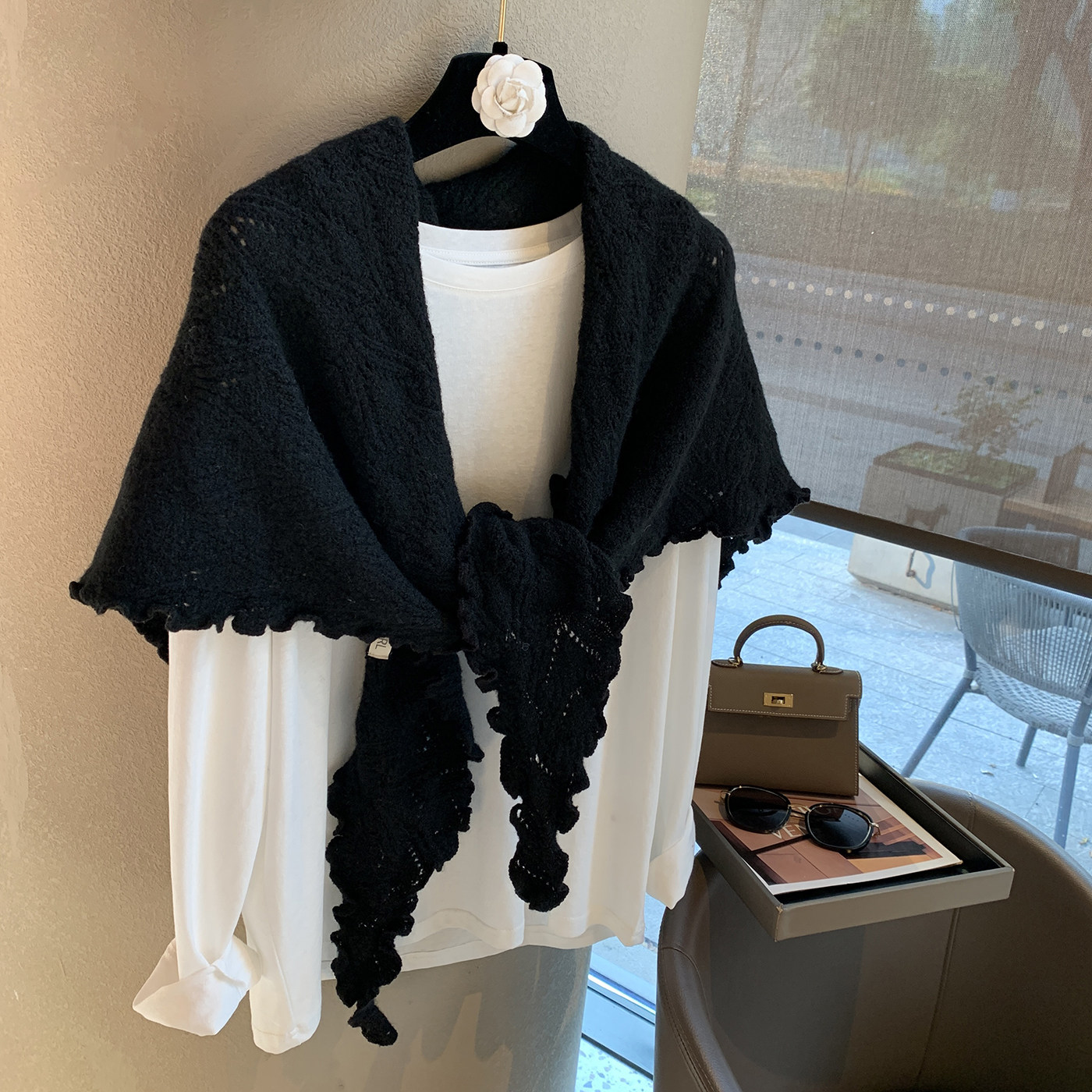 淘宝慵懒风氛围木耳边三角巾羊毛披肩女秋冬薄款围巾两用保暖围脖韩!