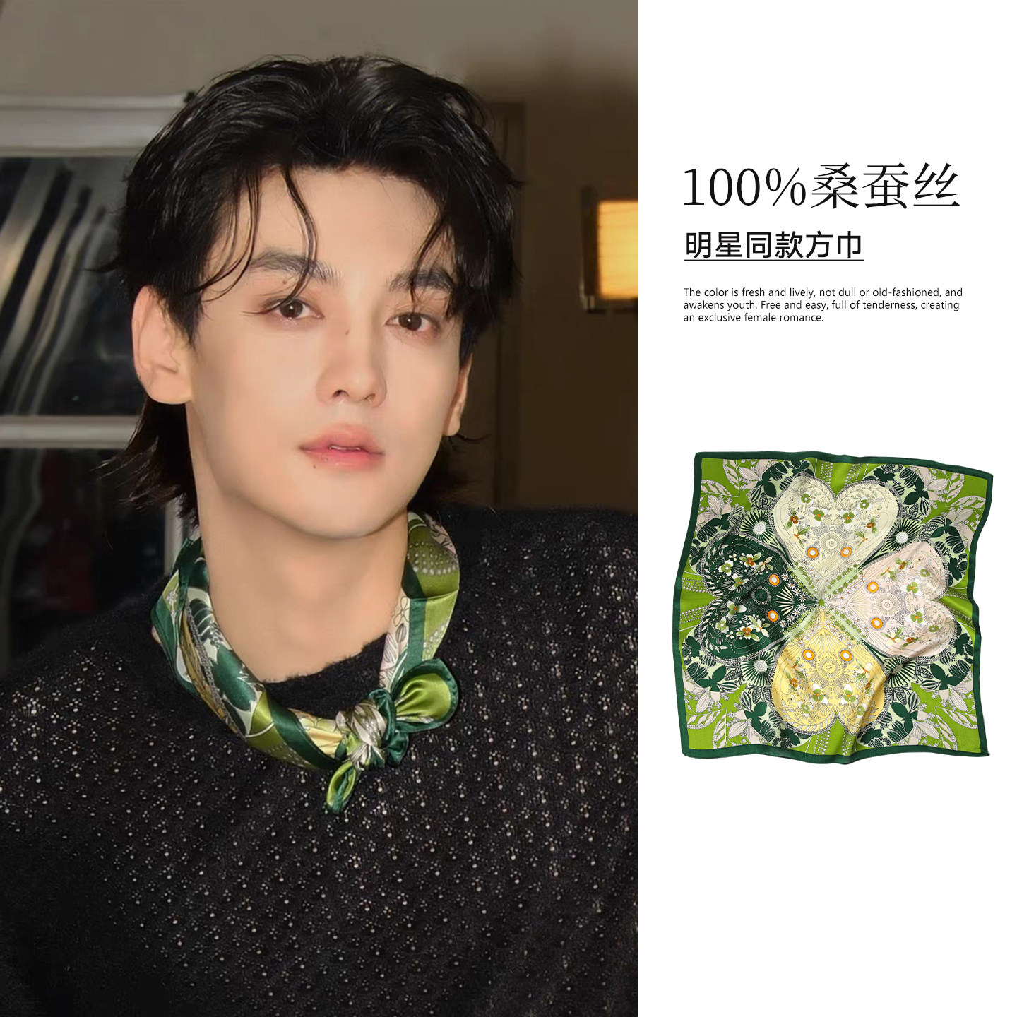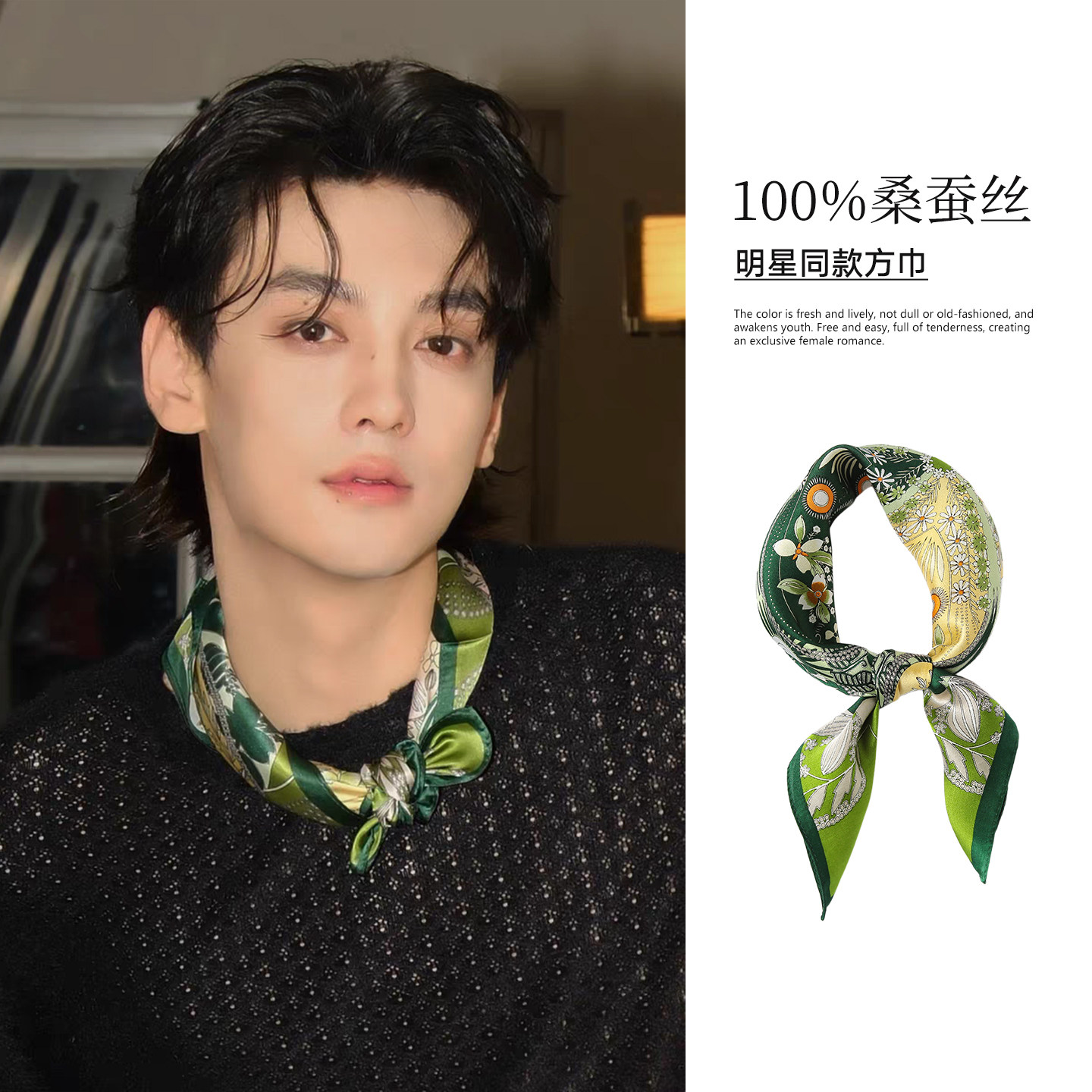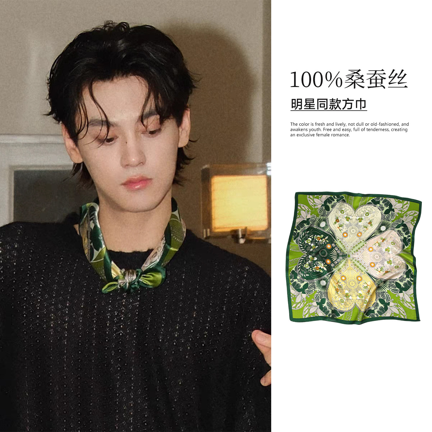 天猫田栩宁同款丝巾绿色小方巾男士男款系腰带围巾男生穿搭高级感护颈
