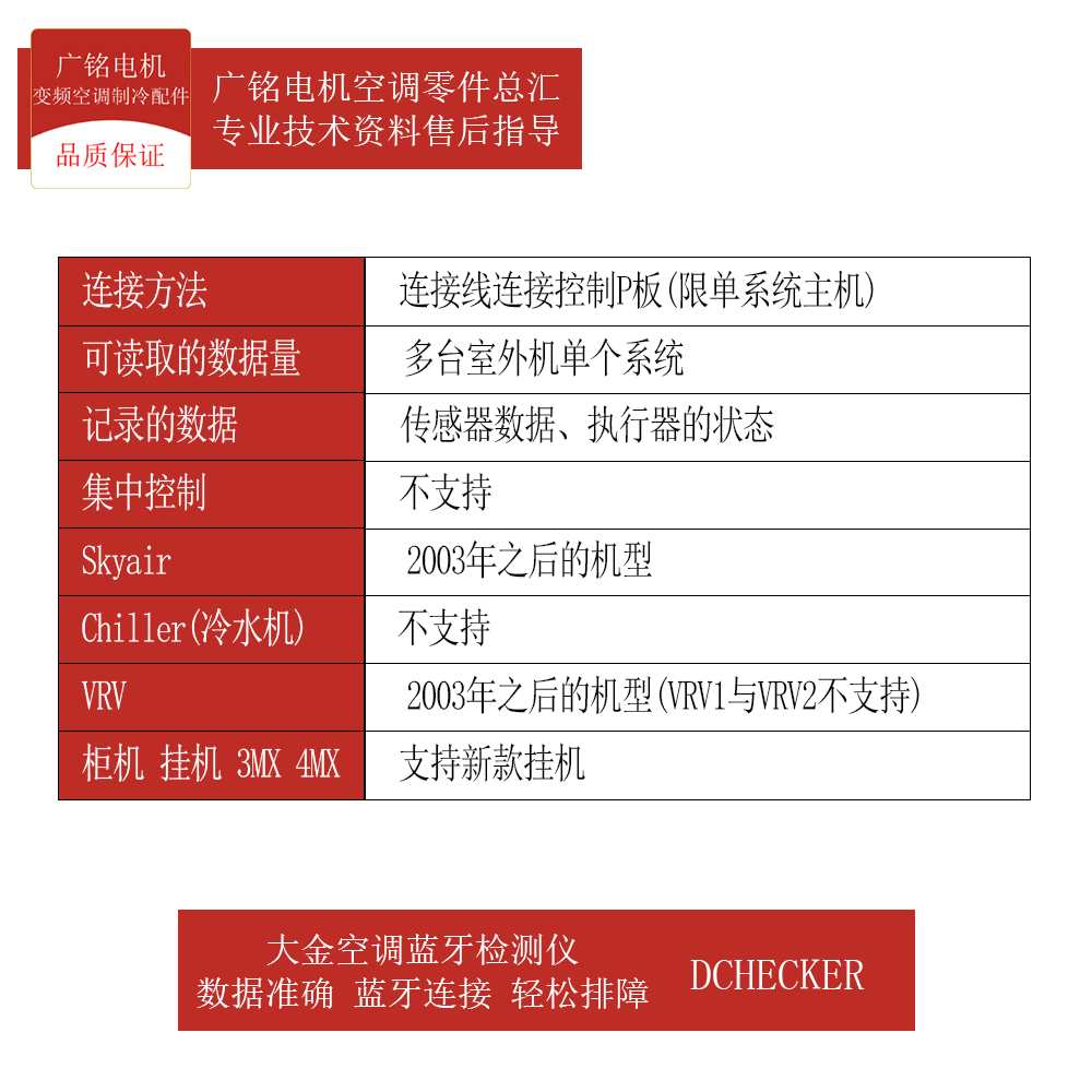 大金变频中央空调DChecker蓝牙检测仪是一款专为技术人员设计的智能诊断工具,通过蓝牙与空调系统连接,实时读取运行数据和故障代码。该检测仪支持对大金多款变频中央空调进行远程监控与故障分析,可快速识别系统异常、传感器故障、通信错误等问题,并提供详细的故障排除建议。其直观的界面和精准的代码解析功能,显著提升了维修效率,减少误判率。适用于安装、维保及售后服务场景,帮助用户实现高效、精准的故障诊断,保障空调系统稳定运行,是大金空调专业服务的得力助手。