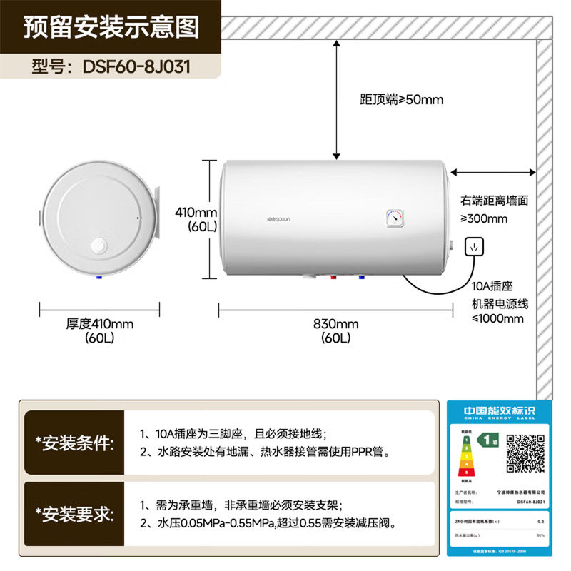 【焕新补贴】帅康8J031储水式电热水器,专为现代家庭打造,40L/50L/60L多容量可选,满足不同家庭洗浴需求。采用高效速热技术,加热迅速,告别漫长等待,即开即洗更省心。搭载多重安全防护系统,包括防电墙、防干烧、超温保护等,守护全家沐浴安全。内胆经高温烧结工艺处理,防腐耐用,延长使用寿命。智能预约功能,可提前设定加热时间,节能省电更便捷。现参与“焕新补贴”活动,享受政府补贴优惠,升级品质生活更实惠。简约外观设计,适配各类卫生间风格,是家庭热水升级的理想之选。