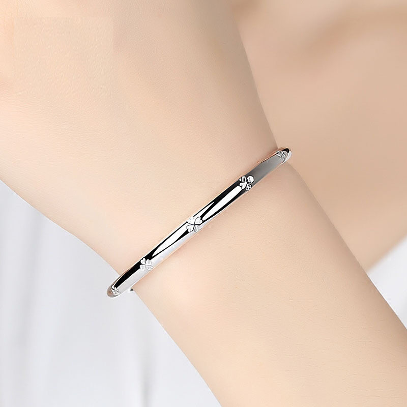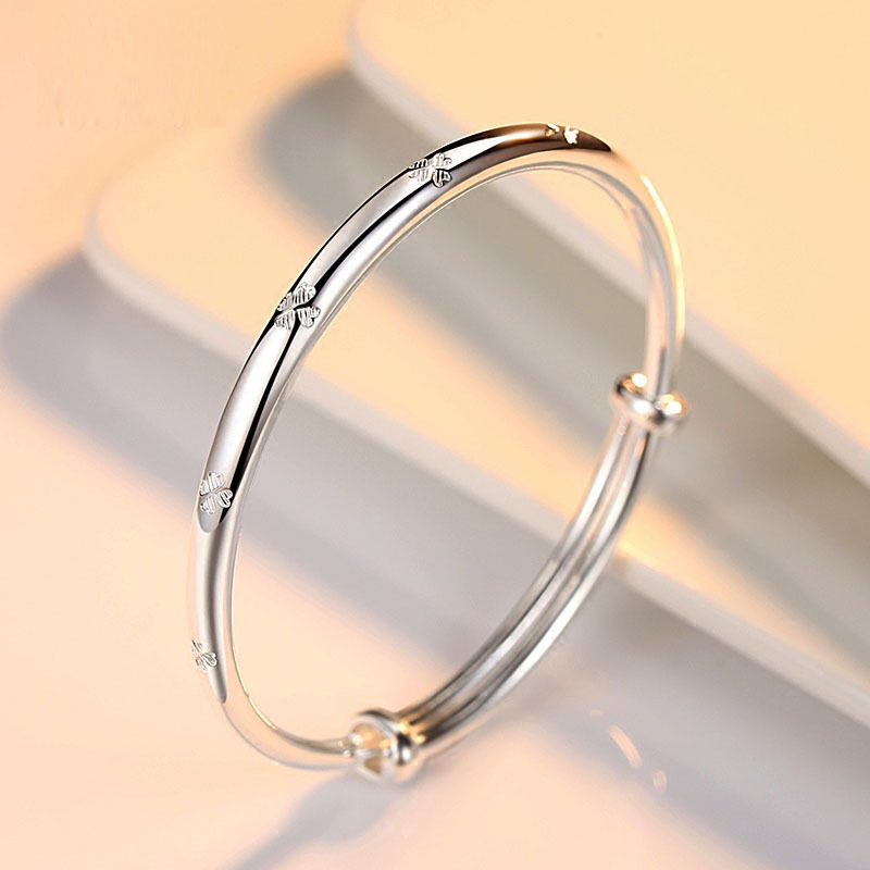 天猫香港正生纯银9999足银 纯银手镯 女式推拉手环光面四叶草 银手饰