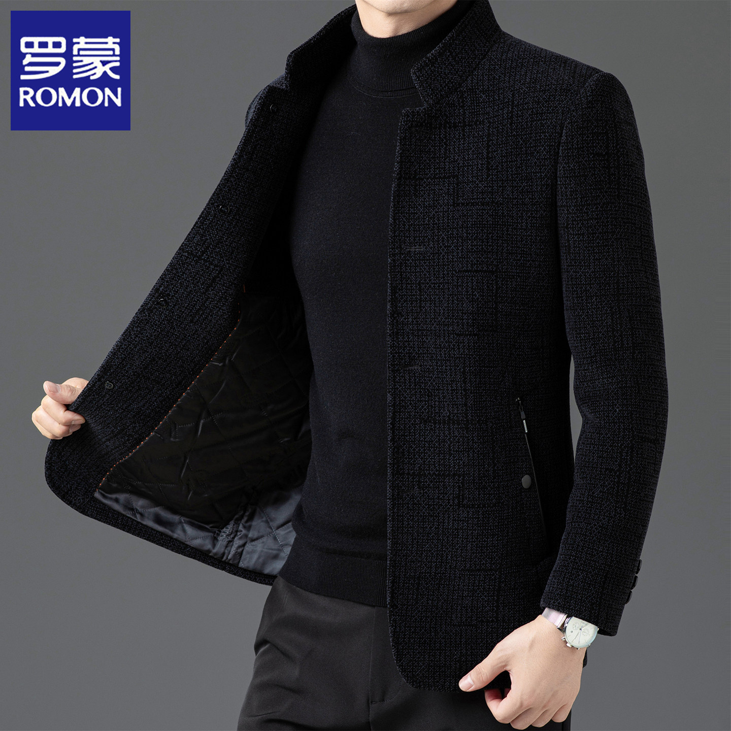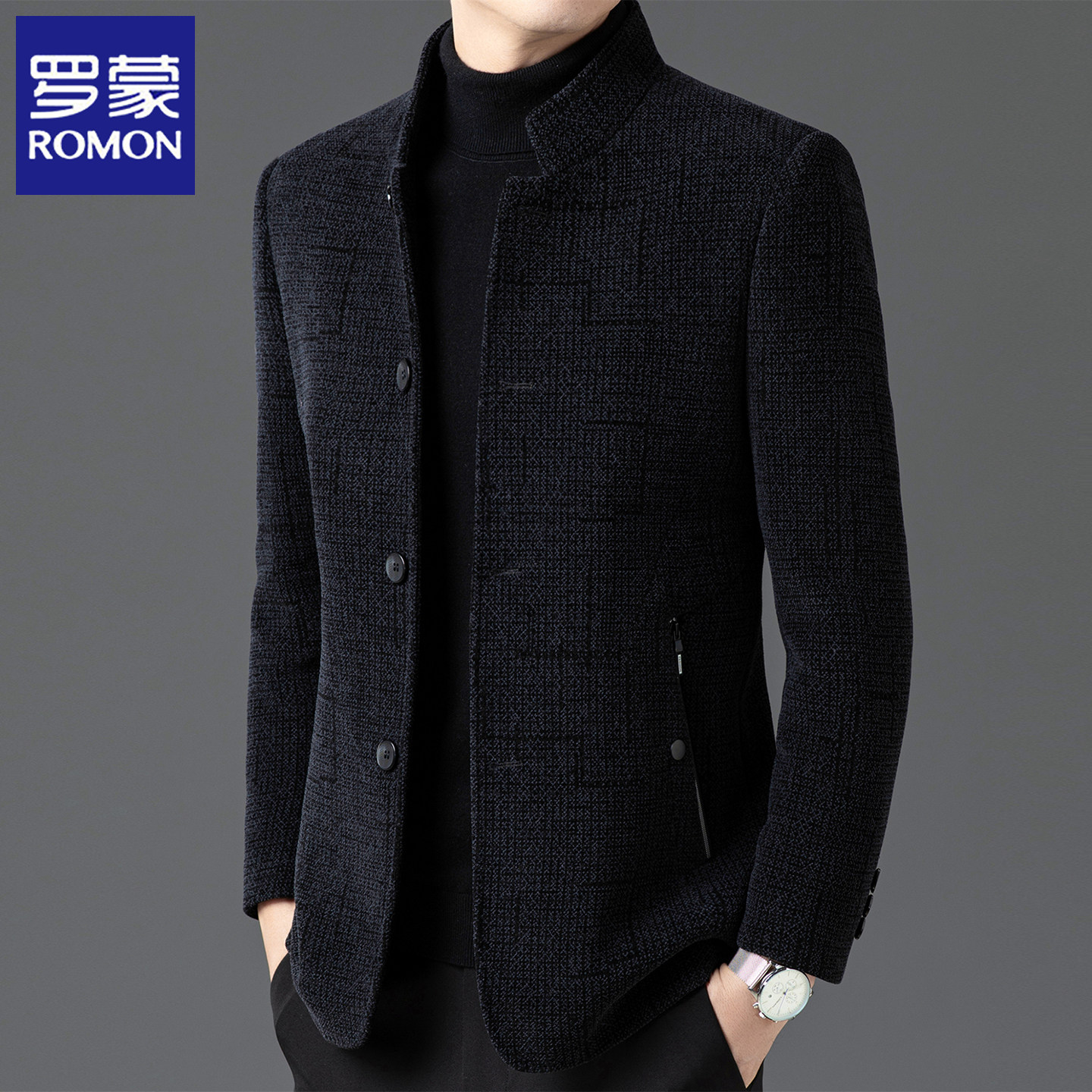 淘宝罗蒙中山装男士立领呢子外套秋冬季中式西服爸爸毛呢加厚保暖夹克