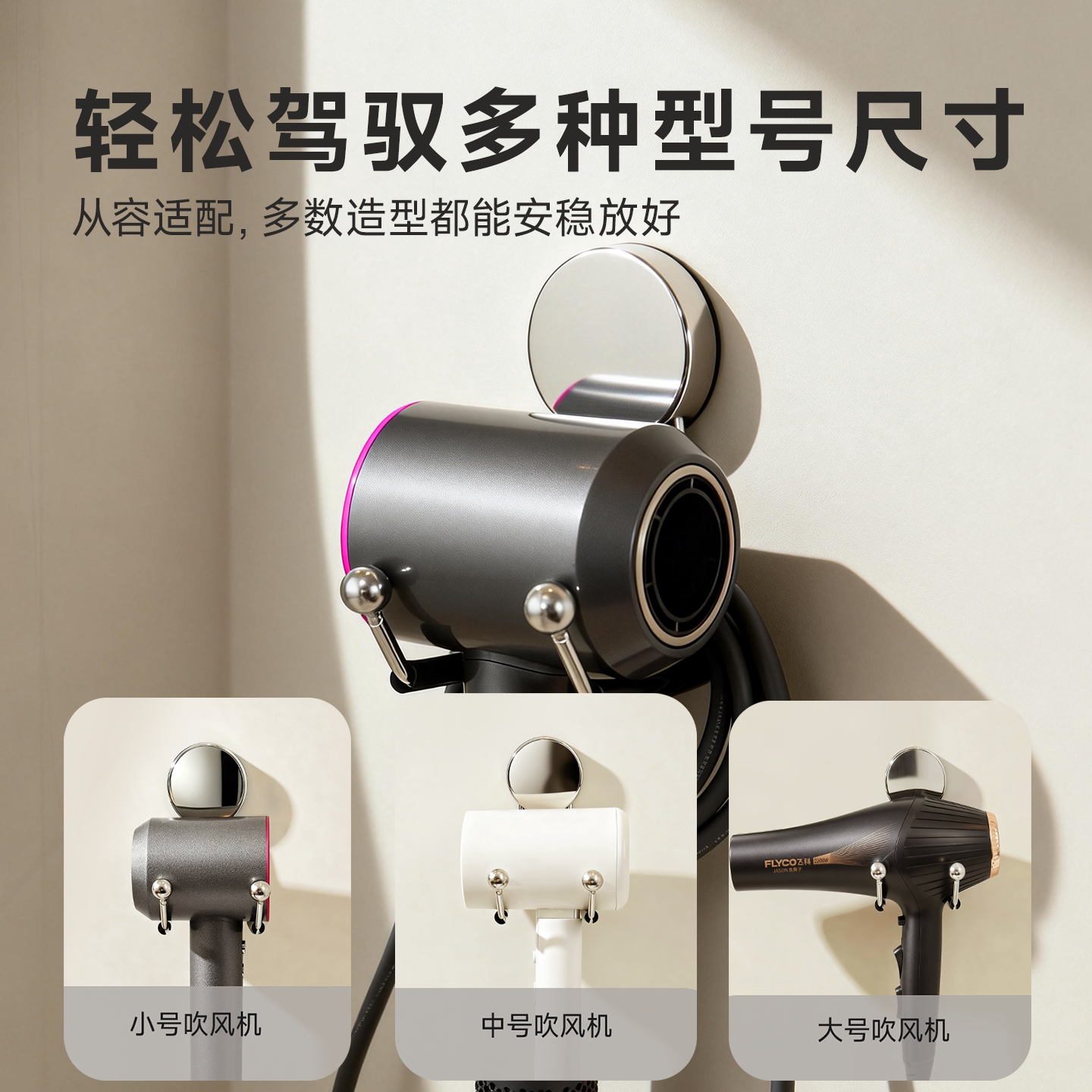 这款吸盘不锈钢吹风机架,专为卫生间、浴室设计,采用高强度不锈钢材质,防锈耐腐蚀,经久耐用。无需打孔安装,配备强力真空吸盘,可牢固吸附于瓷砖、玻璃等光滑表面,拆卸不留痕,轻松更换位置。架体结构稳固,专为电吹风量身定制,有效收纳风筒,避免水汽侵蚀,保持台面整洁。简约时尚的外观设计,兼具实用性与美观性,是提升浴室空间利用率的好帮手。适用于多种型号吹风机,安装便捷,即贴即用,是现代家庭理想的免打孔壁挂收纳解决方案。